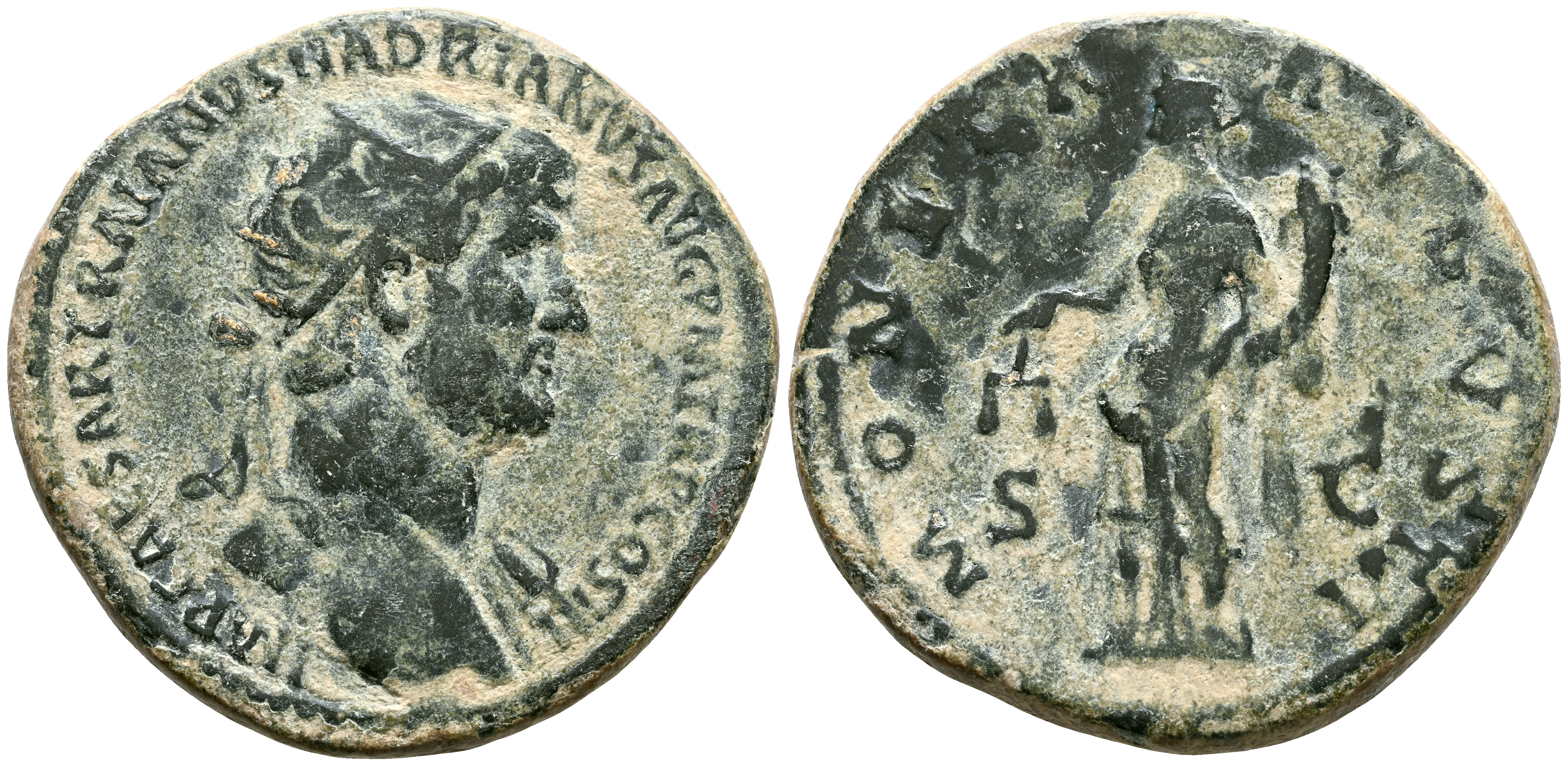 ADRIANO. Dupondio. (Ae. 10,39g/27mm). 120-121 d.C. Roma. (RIC 441). Anv: Busto radiado de Adriano a derecha con drapeado de sobre hombro izquierdo, alrededor leyenda: IMP CAESAR TRAIANVS HADRIANVS AVG P M TR P COS III. Rev: Moneta estante a izquierda portando escala y cornucopia, entre: S-C, alrededor leyenda: MONETA AVGVSTI. MBC-.