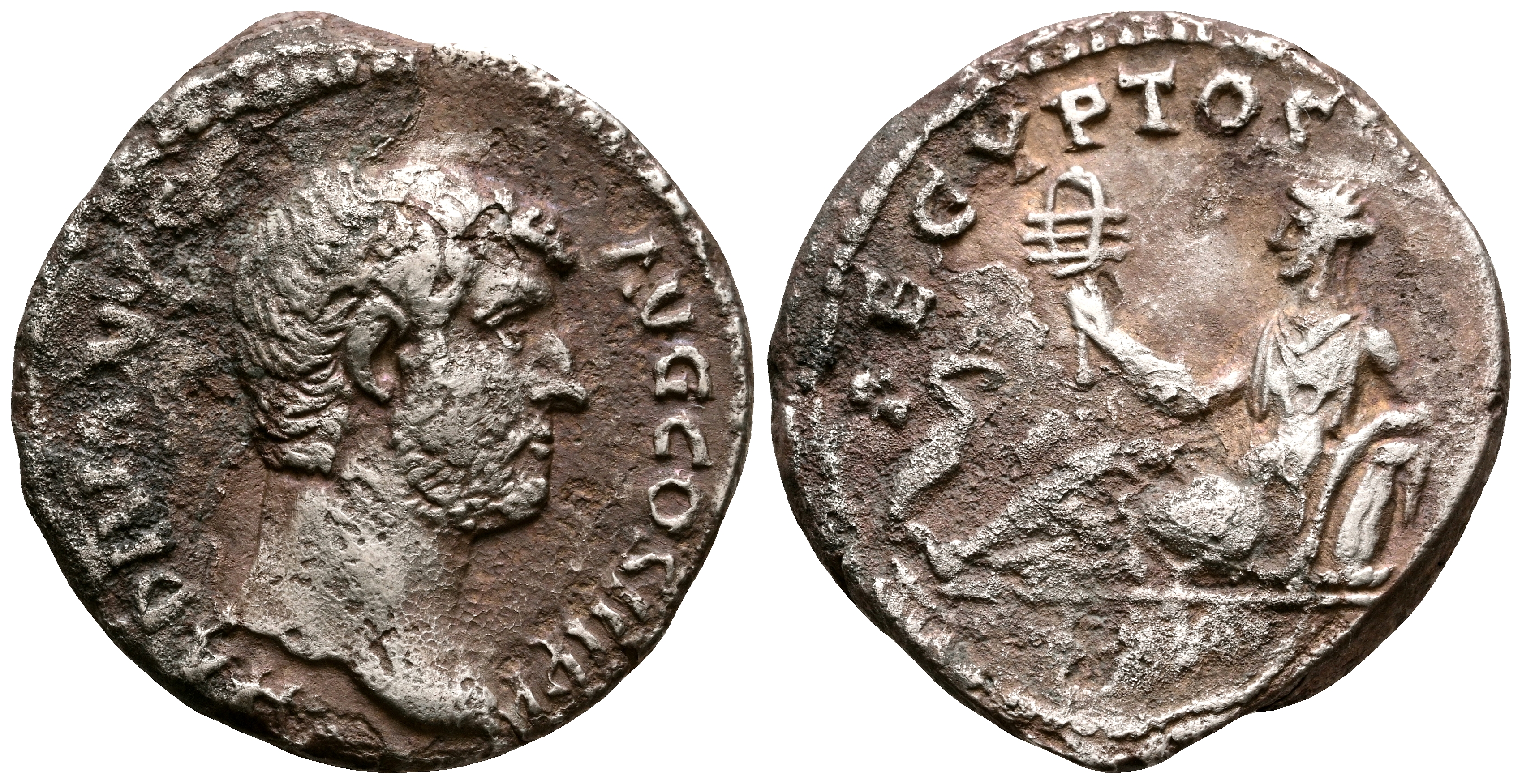ADRIANO. Denario. (Ar. 3,01g/17mm). 130-133 d.C. Roma. (RIC 297). Anv: Cabeza de Adriano a derecha, alrededor leyenda: HADRIANVS AVG COS II P P. Rev: Aegyptos tumbada a izquierda portando sistro y apoyando codo izquierda sobre canasta, a sus pies Ibis estante a derecha, encima leyenda: AEGYPTOS. MBC-. Oxidaciones.