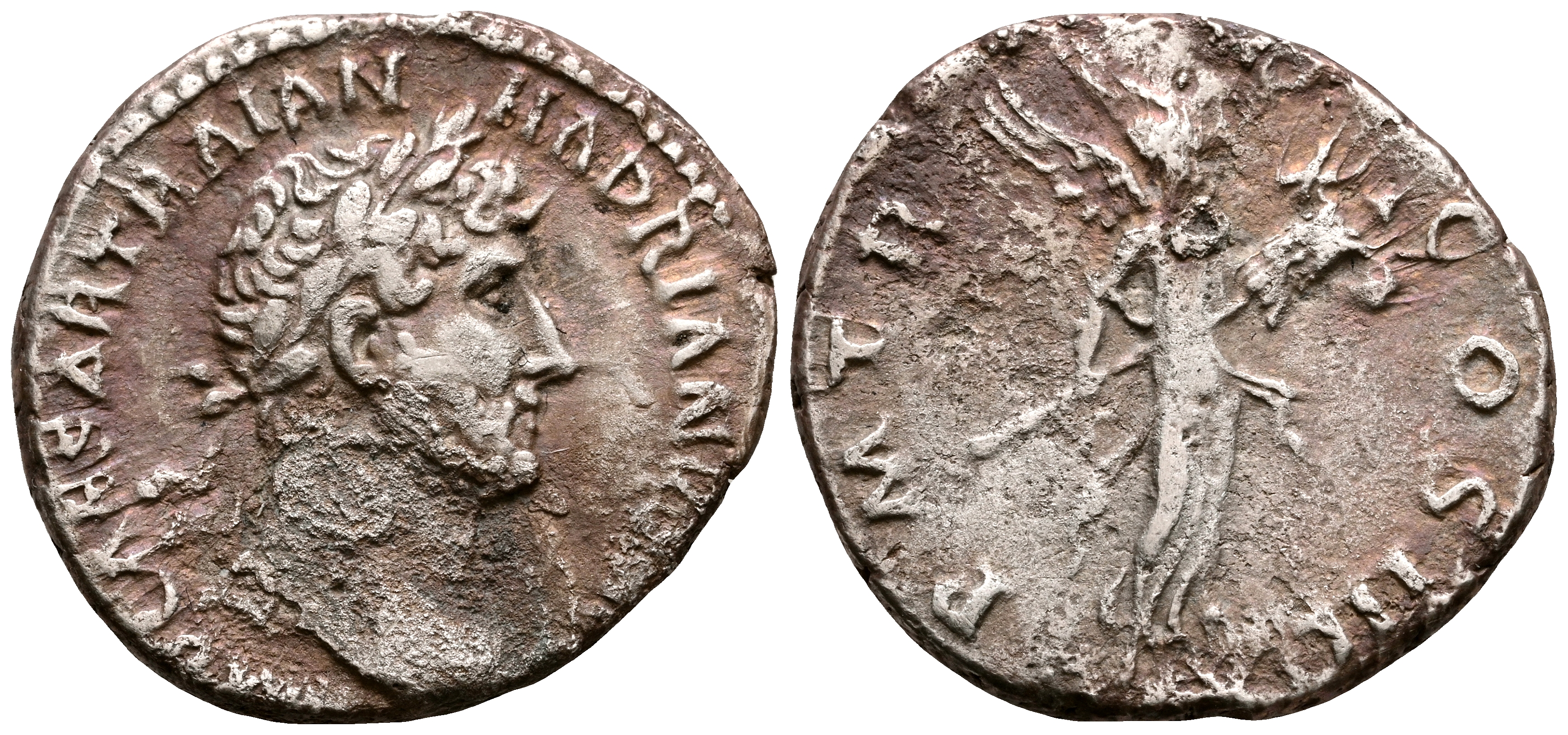 ADRIANO. Denario. (Ar. 2,64g/18mm). 120-121 d.C. Roma. (RIC 397). Anv: Busto laureado y drapeado de Adriano a derecha, alrededor leyenda: IMP CAESAR TRAIAN HADRIANVS AVG. Rev: Victoria avanzando a derecha portando trofeo, alrededor leyenda: P M TR P COS III. MBC-.