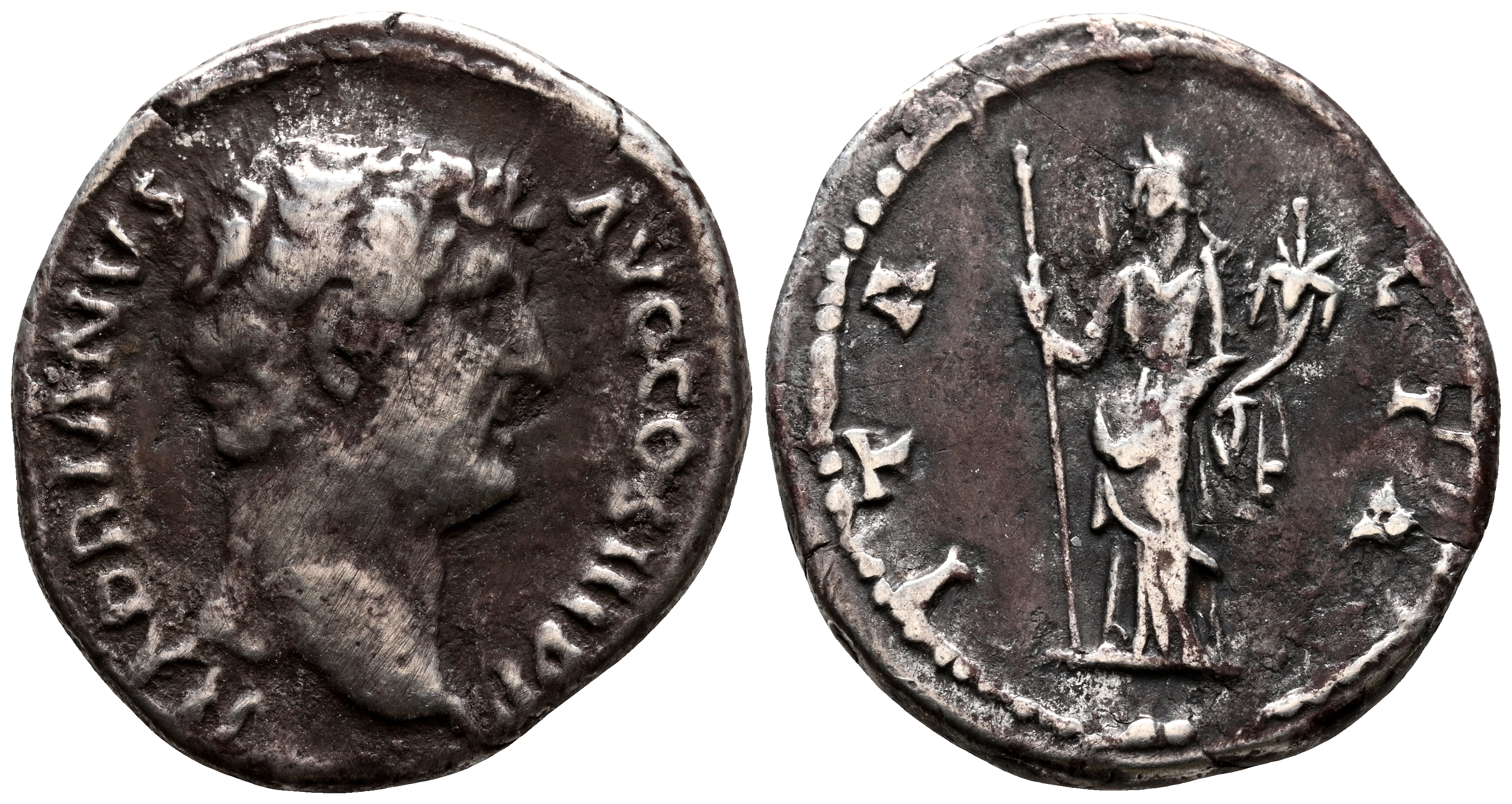 ADRIANO. Denario. (Ar. 2,68g/18mm). 130-133 d.C. Roma. (RIC 1541). Anv: Cabeza desnuda de Adriano a derecha, alrededor leyenda: HADRIANVS AVG COS III P P. Rev: Italia estante a izquierda portando cetro y cornucopia, alrededor leyenda: ITALIA. MBC-.