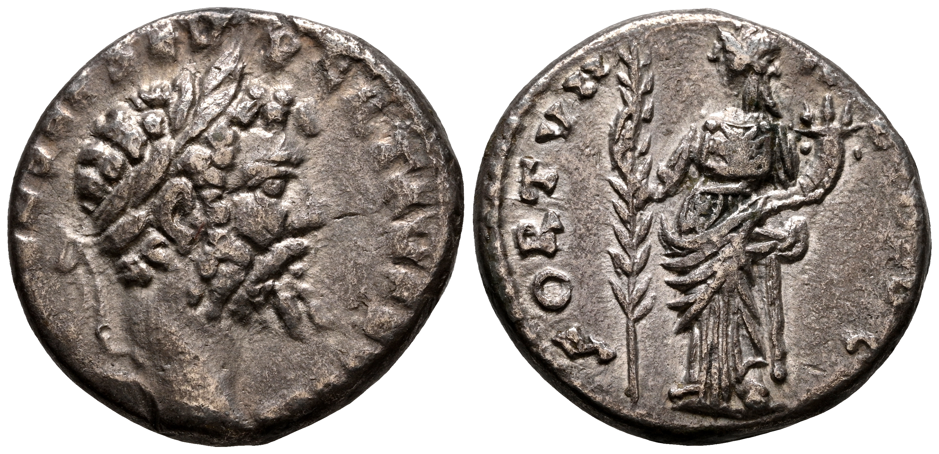 SEPTIMIO SEVERO. Denario. (Ar. 2,90g/16mm). 194-195 d.C. Emesa. (RIC 383). Anv: Cabeza laureada de Septimio Severo a derecha, alrededor leyenda: IMP CAE L SEP SEV PERT PROG COS II. Rev: Fortuna a izquierda portando palma y cornucopia, alrededor leyenda: FORTVN REDVC. MBC-. Escaso.