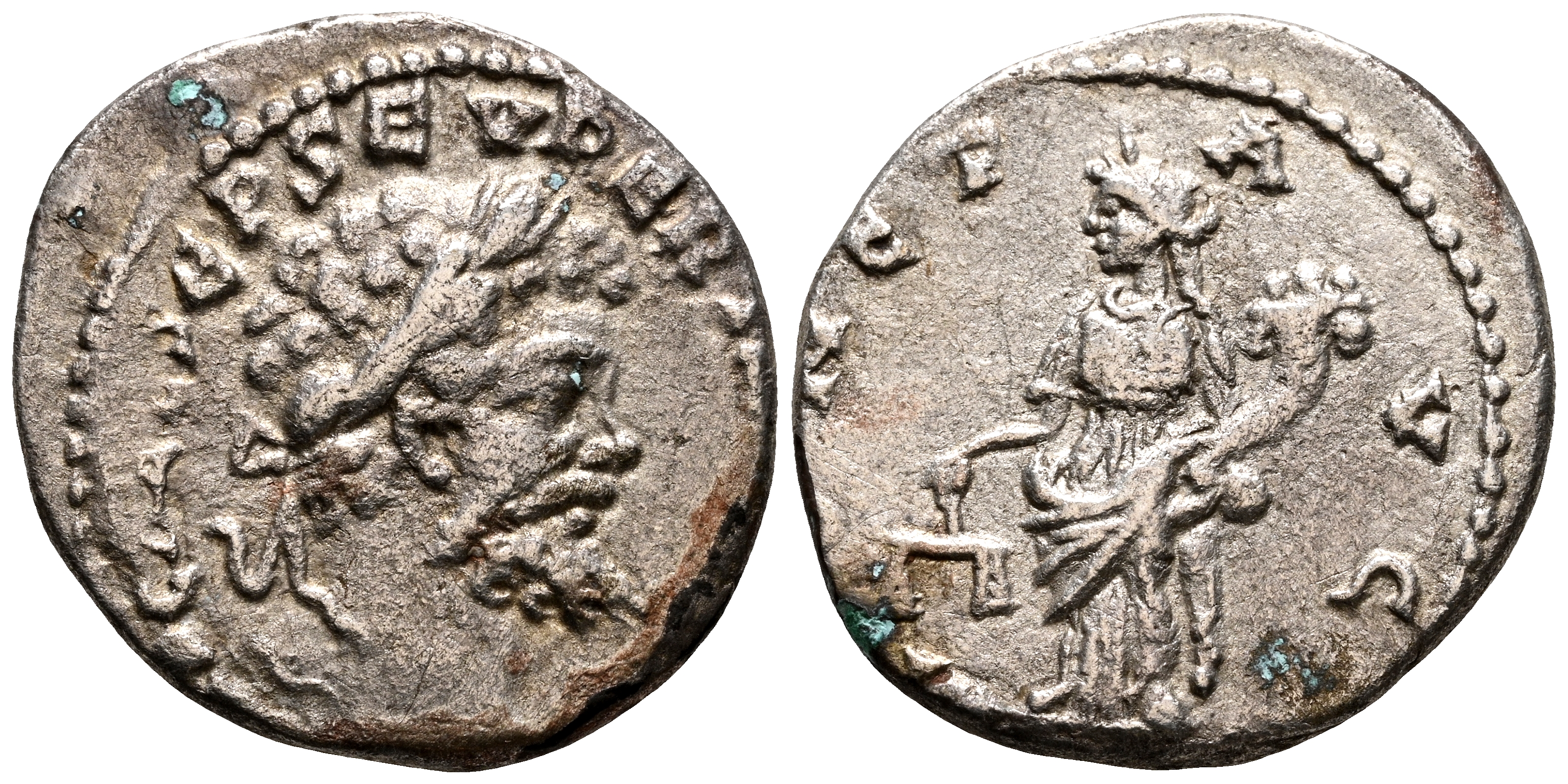 SEPTIMIO SEVERO. Denario. (Ar. 2,42g/17mm). 194-195 D.C. Emesa. (RIC 411a). Anv: Cabeza laureada de Septimio Severo a derecha, alrededor leyenda: IMP CAE L SEP SEV PERT AVG COS II. Rev: Moneta estante a izquierda portando escalas y cornucopia, alrededor leyenda: MONETA AVG. MBC-.