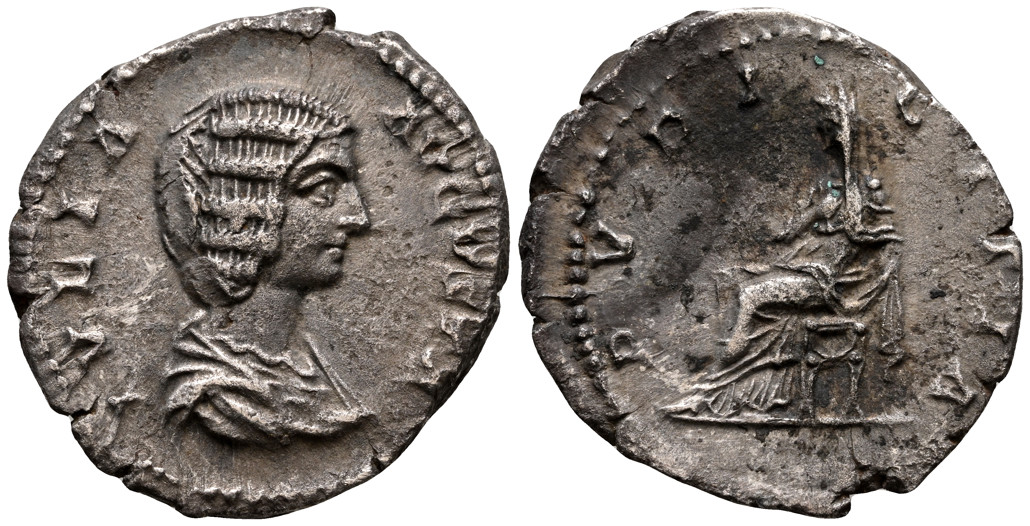 JULIA DOMNA. Denario. (Ar. 2,89g/19mm). 198-202 d.C. Roma. (RIC 576). Anv: Busto drapeado de Julia Domna a derecha, alrededor leyenda: IVLIA AVGVSTA. Rev: Pudicita sentada a izquierda, alrededor leyenda: PVDICITIA. MBC-.