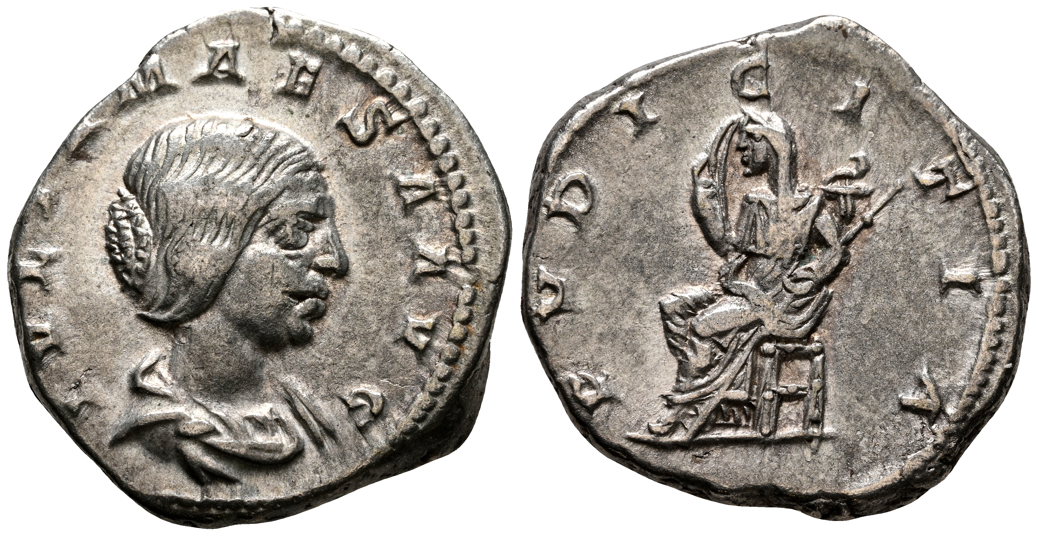 JULIA MAESA. Denario. (Ar. 3,73Gg/19mm). 218-222 d.C. Roma. (RIC 268). Anv: Busto drapeado de Julia Maesa a derecha, alrededor leyenda: IVLIA MAESA AVG. Rev: Pudicitia sentada a izquierda portando cetro, alrededor leyenda: PVDICITIA. MBC+.