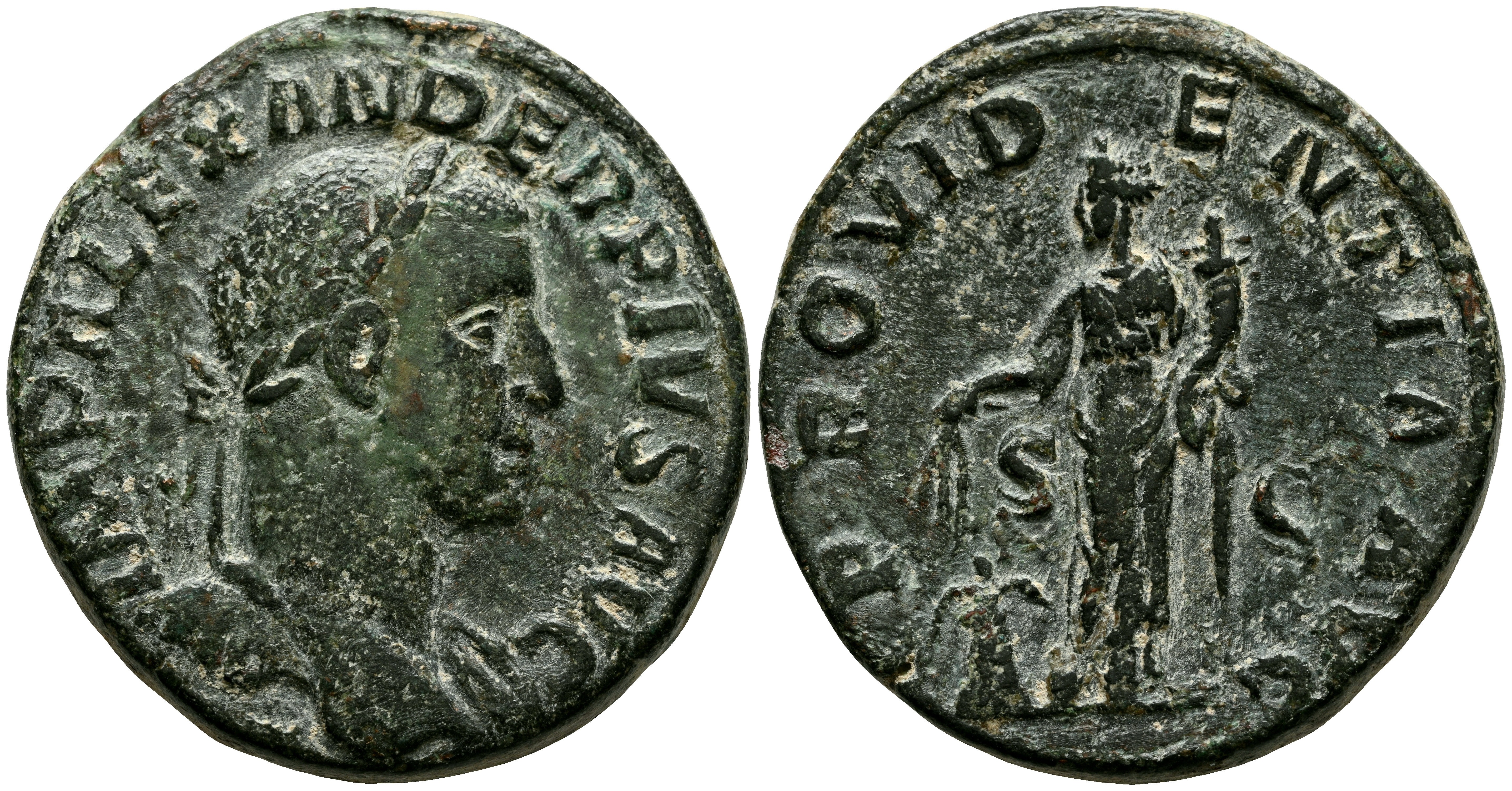 ALEJANDRO SEVERO. Sestericio. (Ae. 20,13g/30mm). 231 d.C. Roma. (RIC 642). Anv: Busto laureado con drapeado sobre hombro izquierdo de Alejandro Severo a derecha, alrededor leyenda: IMP ALEXANDER PIVS AVG. Rev: Providentia estante a izquierda portando espigas sobre modio y cornucopia, entre: S-C, alrededor leyenda: PROVIDENTIA AVG. MBC+.