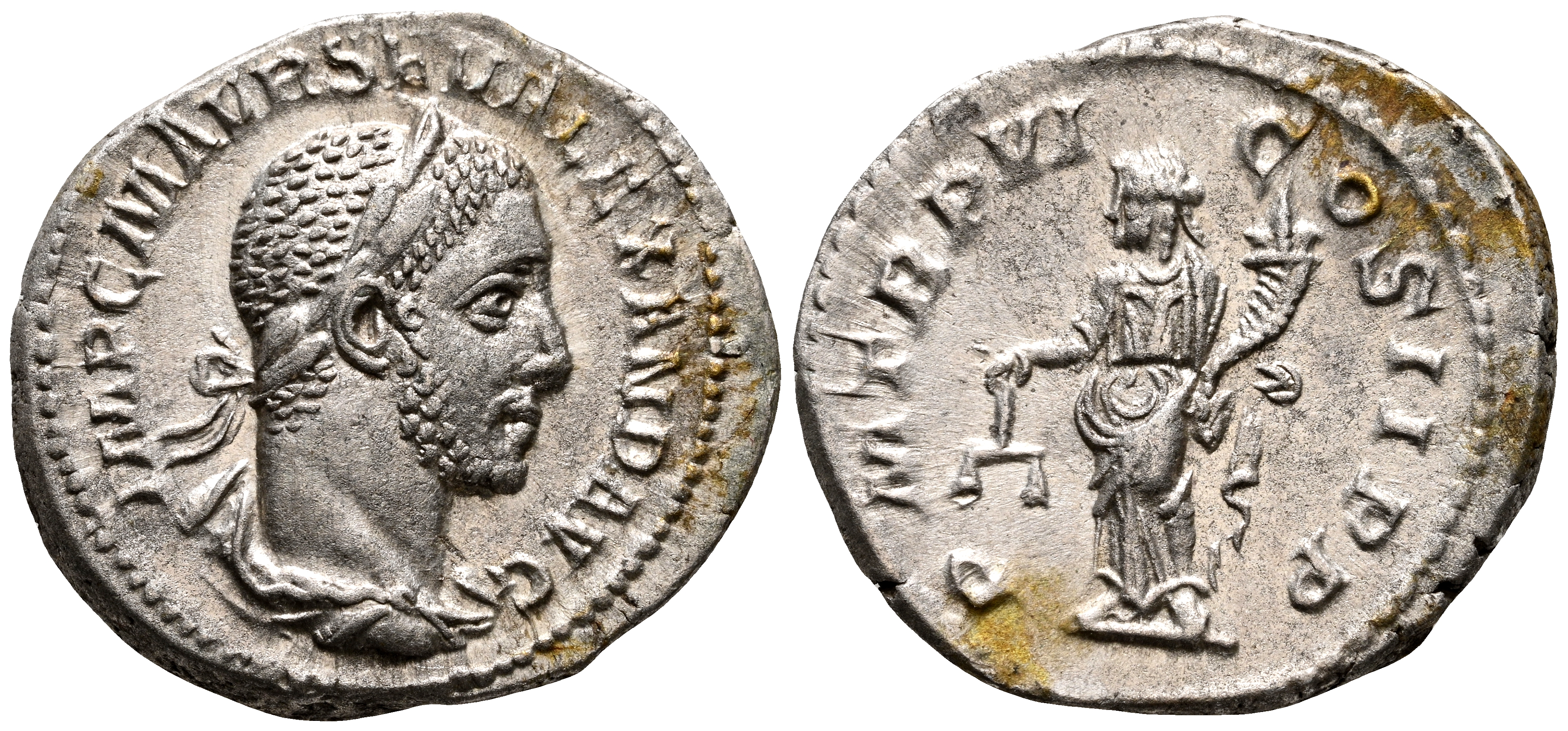 ALEJANDRO SEVERO. Denario. (Ar. 3,35g/20mm). 227 d.C. Roma. (RIC 64). Anv: Busto laureado y drapeado de Alejandro Severo a derecha, alrededor leyenda: IMP C M AVR SEV ALEXAND AVG. Rev: Aequitas estante a izquierda portando escalas y cornucopia, alrededor leyenda: P M TR P VI COS II P P. MBC+.