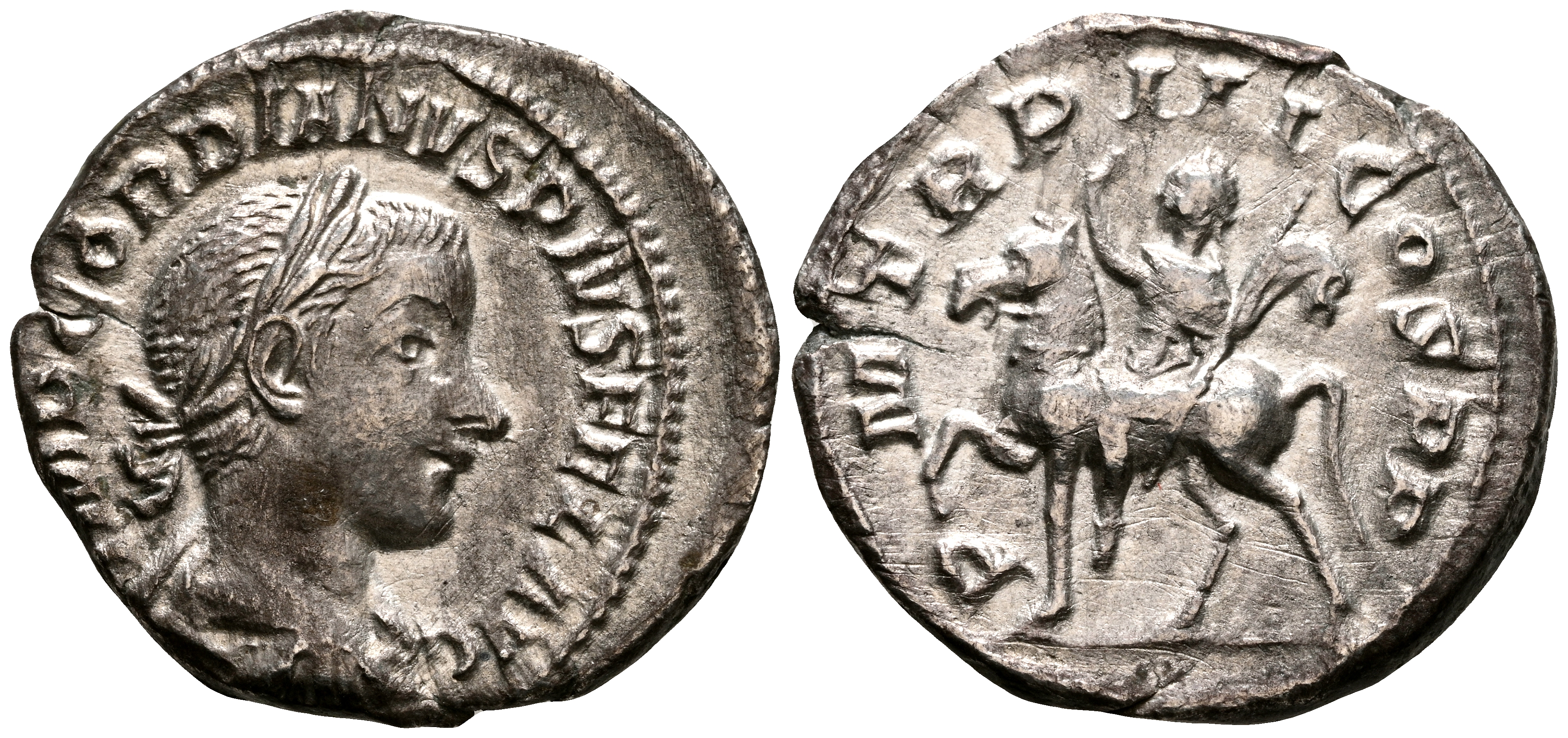 GORDIANO III. Denario. (Ar. 2,12g/20mm). 240 D.C. Roma. (RIC 81). Anv: Busto diademado y drapeado de Gordiano III a derecha, alrededor leyenda: IMP GORDIANVS PIVS FEL AVG. Rev: Gordiano III portando cetro y saludando sobre caballo a izquierda, alrededor leyenda: P M TR P III COS P P. MBC.
