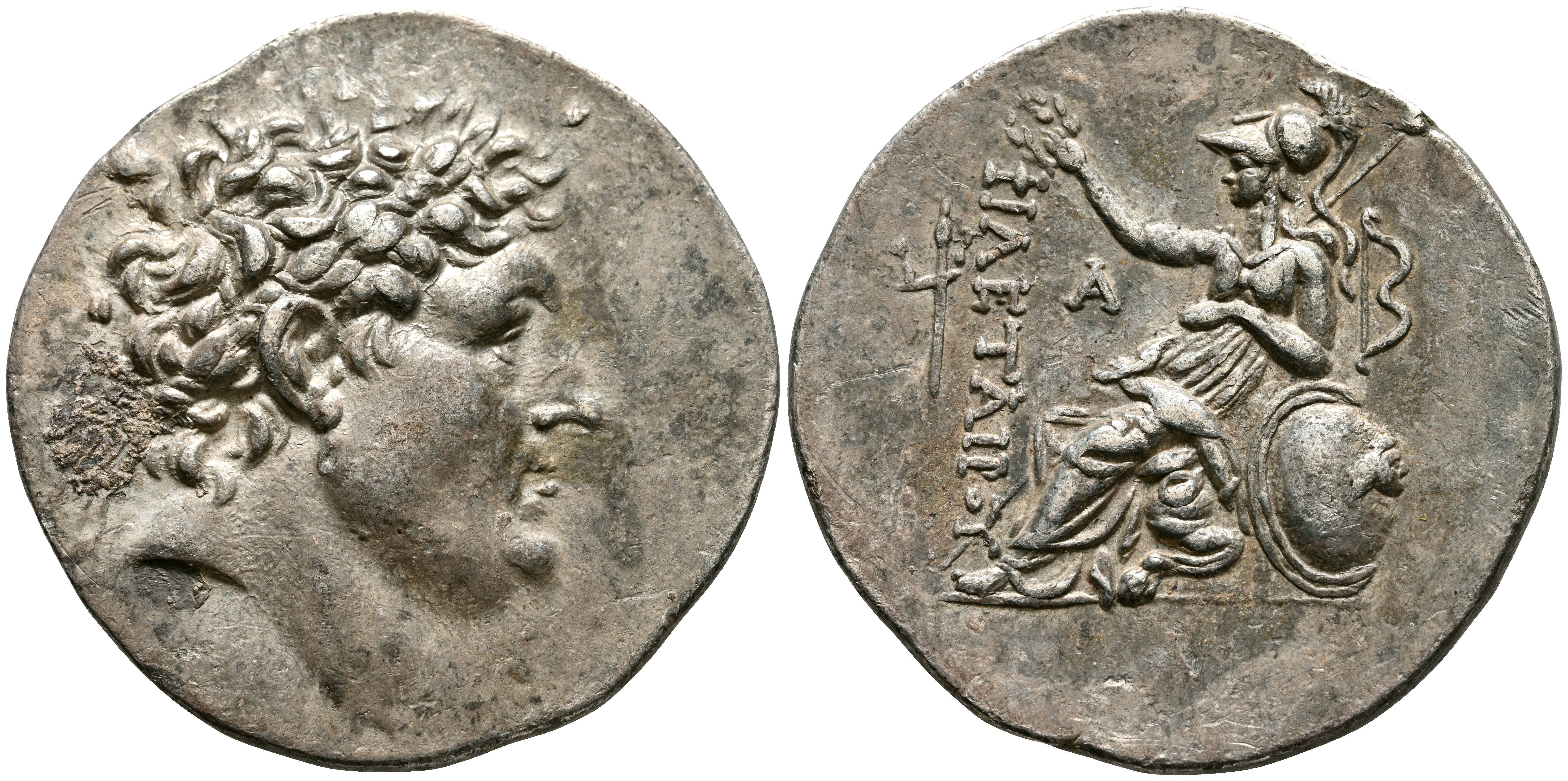 REYES DE PERGAMO, Eumenes II. Tetradracma. (Ae. 16,41g/33mm). 197-158 a.C. (SNG von Aulock 1361). Anv: Cabeza laureada a derecha. Rev: Atenea sentada a izquierda portando corona de alurel y cetro, detrás escudo y arco, delante leyenda: ΦΙΛΕΤΑΙΡΟΥ, en tre tridente-A. MBC+. Escaso y bonito ejemplar.