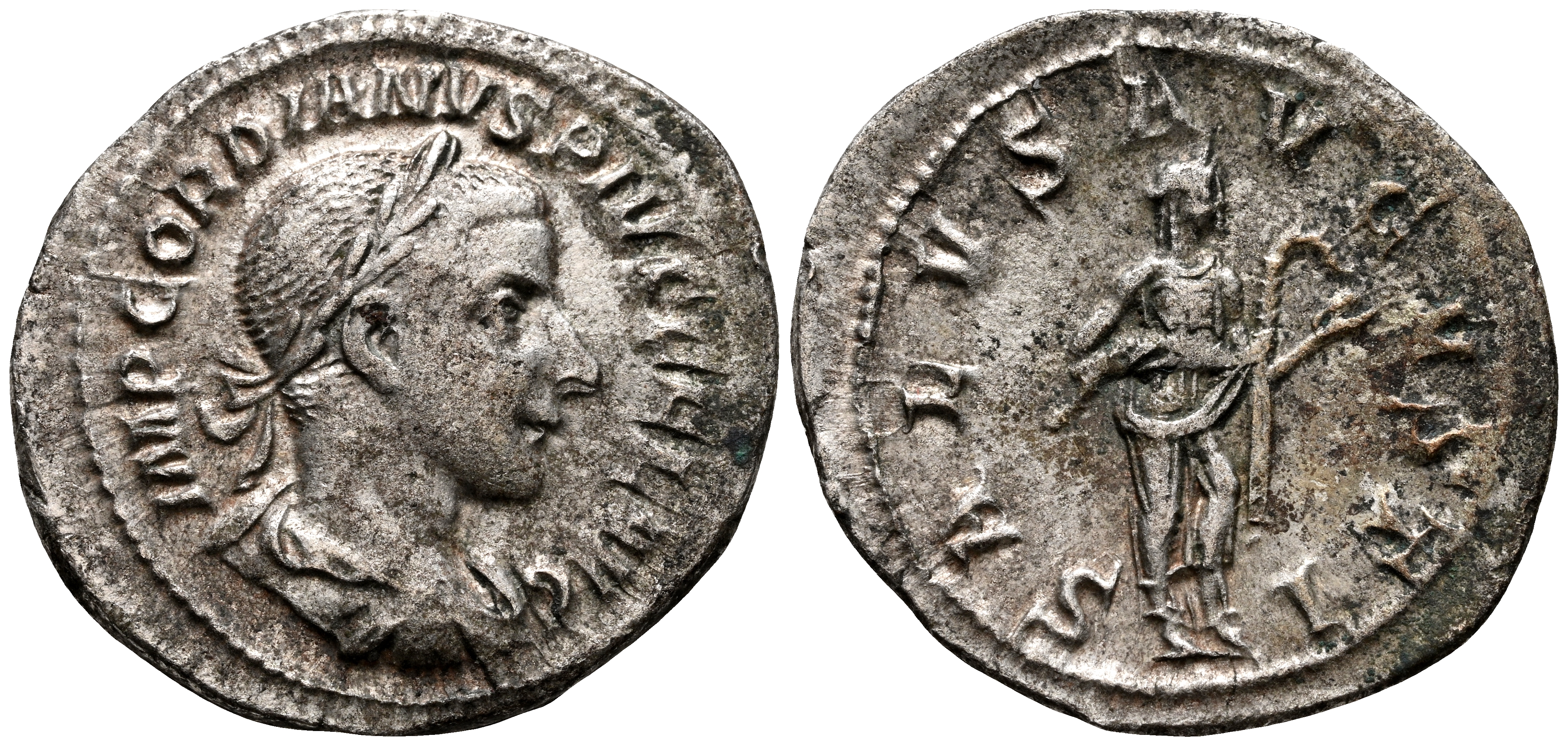 GORDIANO III. Denario. (Ar. 2,47g/21mm). 241 d.C Roma. (RIC 129a). Anv: Busto laureado y drapeado de Gordiano III a la derecha, alrededor leyenda: IMP GORDIANVS PIVS FEL AVG. Rev: Salus a derecha con serpiente en sus brazos, alrededor leyenda: SALVS AVGVSTI. MBC.