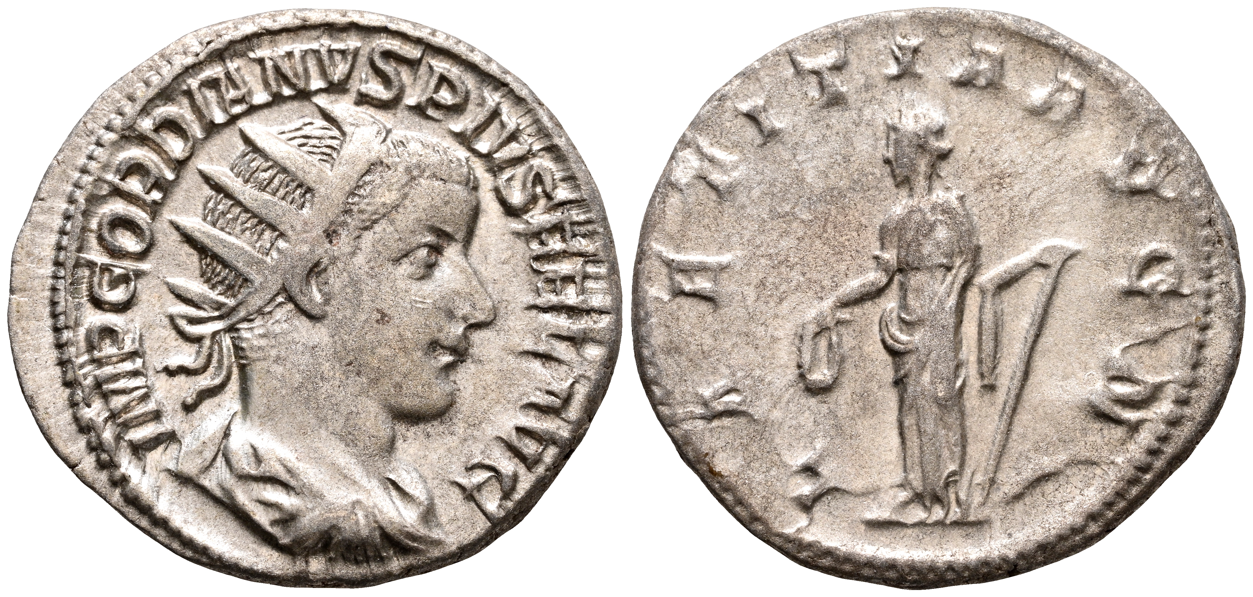 GORDIANO III. Antoniniano. (Ar. 3,70g/22mm). 241-243 d.C. Roma. (RIC 86). Anv: Busto radiado y drapeado de Gordiano III a derecha, alrededor leyenda: IMP GORDIANVS PIVS FEL AVG. Rev: Laetitia estante a izquierda portando corona de laurel y cetro, alrededor leyenda: LAETITIA AVG N. EBC-/MBC+.