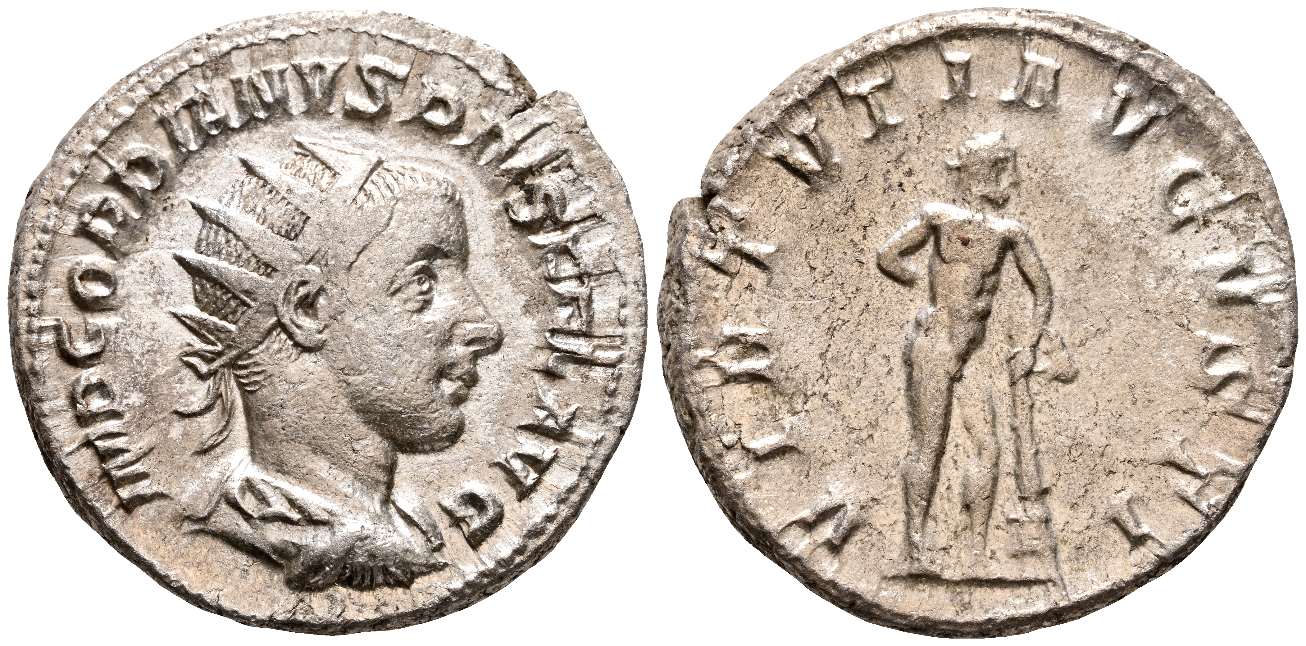 GORDIANO III. Antoniniano. (Ar. 3,98g/22mm). 241-243 d.C. Roma. (RIC 95). Anv: Busto radiado y drapeado de Gordiano III a derecha, alrededor leyenda: IMP GORDIANVS PIVS FEL AVG. Rev: Hércules estante a derecha portando mazo y apoyado en roca, alrededor leyenda: VIRTVTI AVGVSTI. MBC+.
