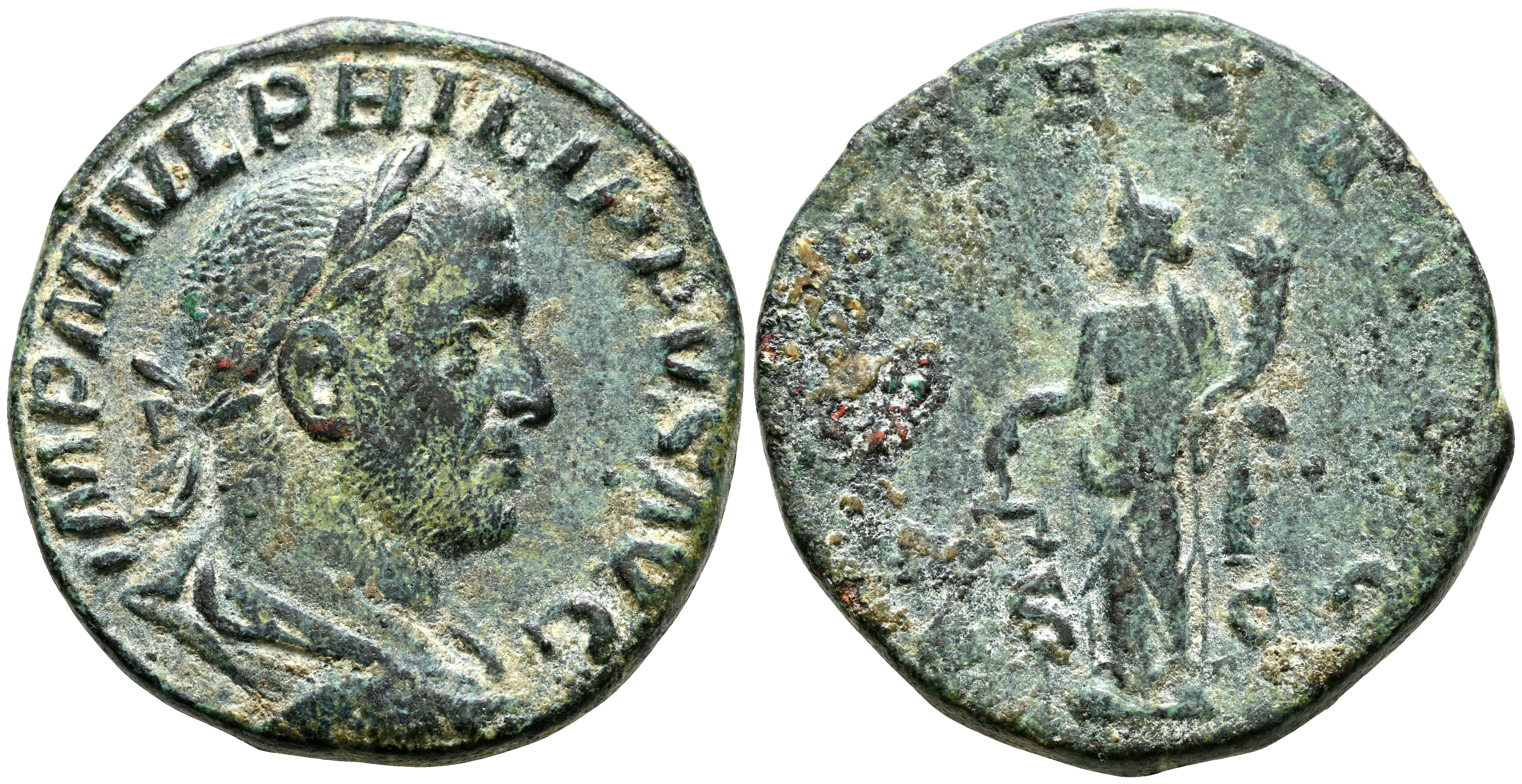 FILIPO I. Sestercio. (Ae. 14,70g/28mm). 245-247 d.C. (RIC 166a). Anv: Busto laureado y drapeado de Filipo I a derecha, alrededor leyenda: IMP M IVL PHILIPPVS AVG. Rev: Aequitas estante a izquierda portando escalas y cornucopia, entre S-C, alrededor leyenda: AEQVITAS AVGG. MBC/MBC-.
