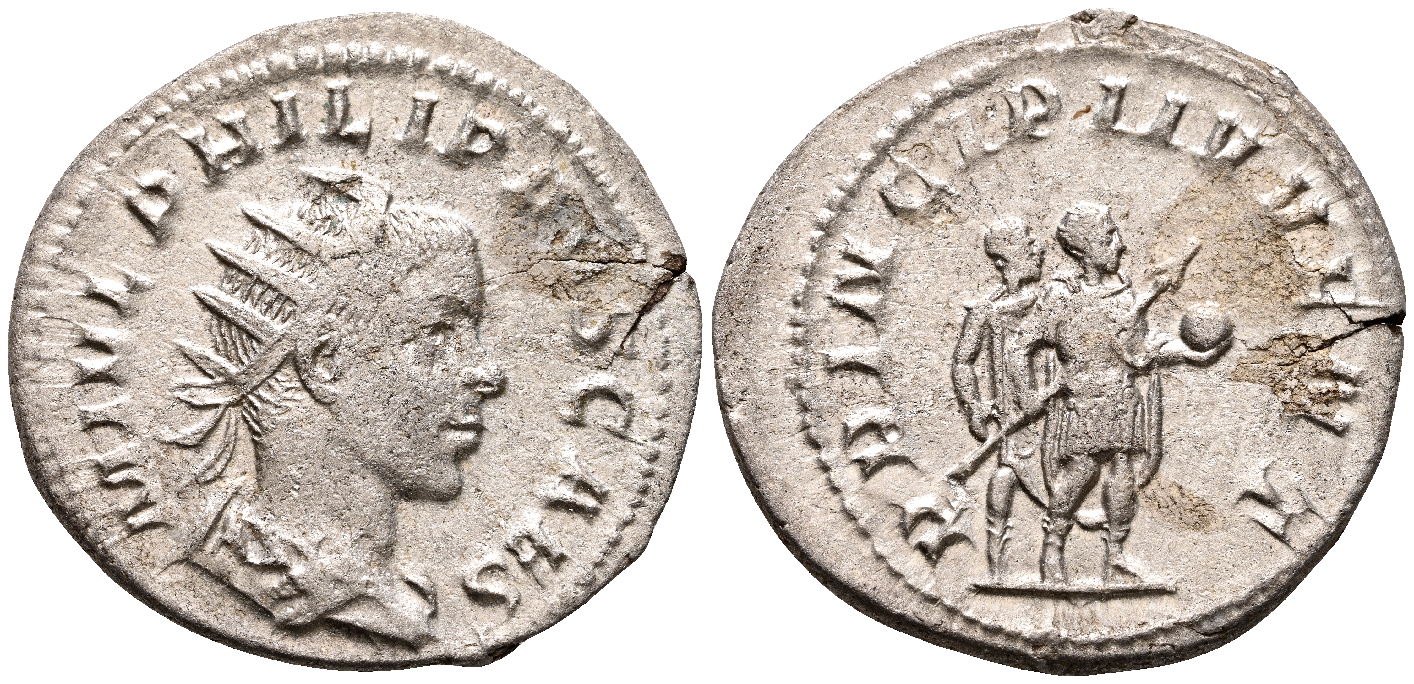 FILIPO II. Antoniniano. (Ar. 2,74g/23mm). 244-246 d.C. Roma. (RIC 217). Anv: Busto radiado y drapeado de Filipo II a derecha, alrededor leyenda: M IVL PHILIPPVS CAES. Rev: Filipo II estante a derecha portando globo y cetro, a su lado, soldado portando lanza, alrededor leyenda: PRINCIPI IVVENT. MBC.