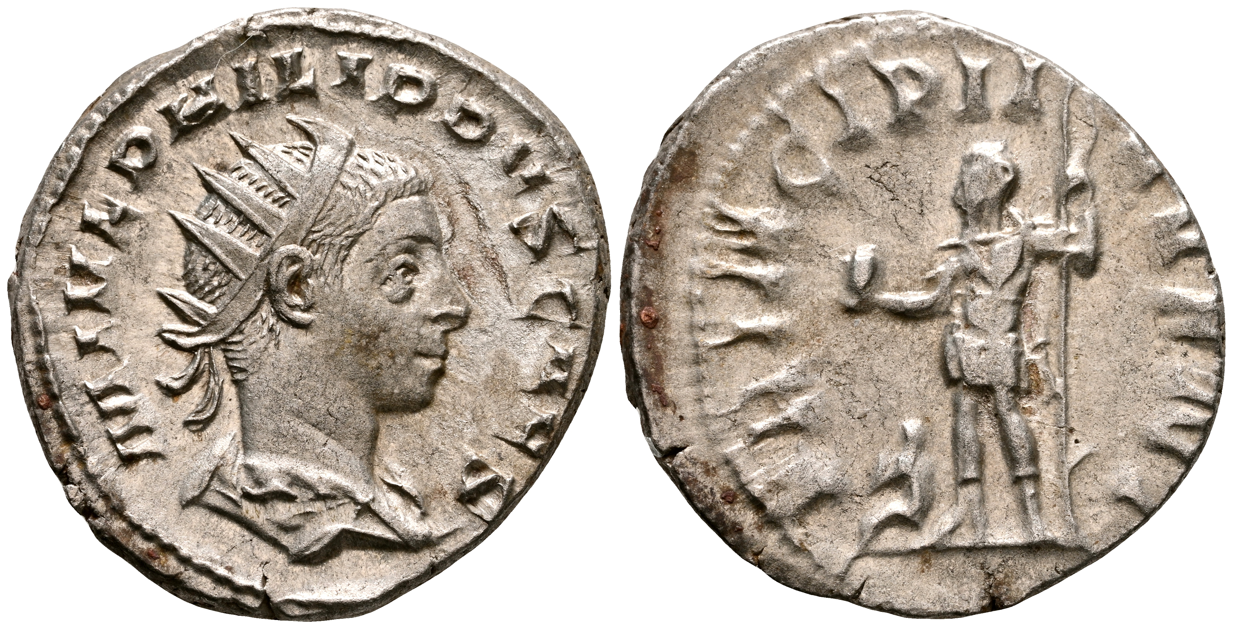 FILIPO II. Antoniniano. (Ar. 4,29g/21mm). 244-246 d.C. Roma. (RIC 219). Anv: Busto radiado y drapeado de Filipo II a derecha, alrededor leyenda: M IVL PHILIPPVS CAES. Rev: Filipo II estante a izquierda portando globo y lanza, cautivo a sus pies, alrededor leyenda: PRINCIPI IVVENT. MBC+/MBC.