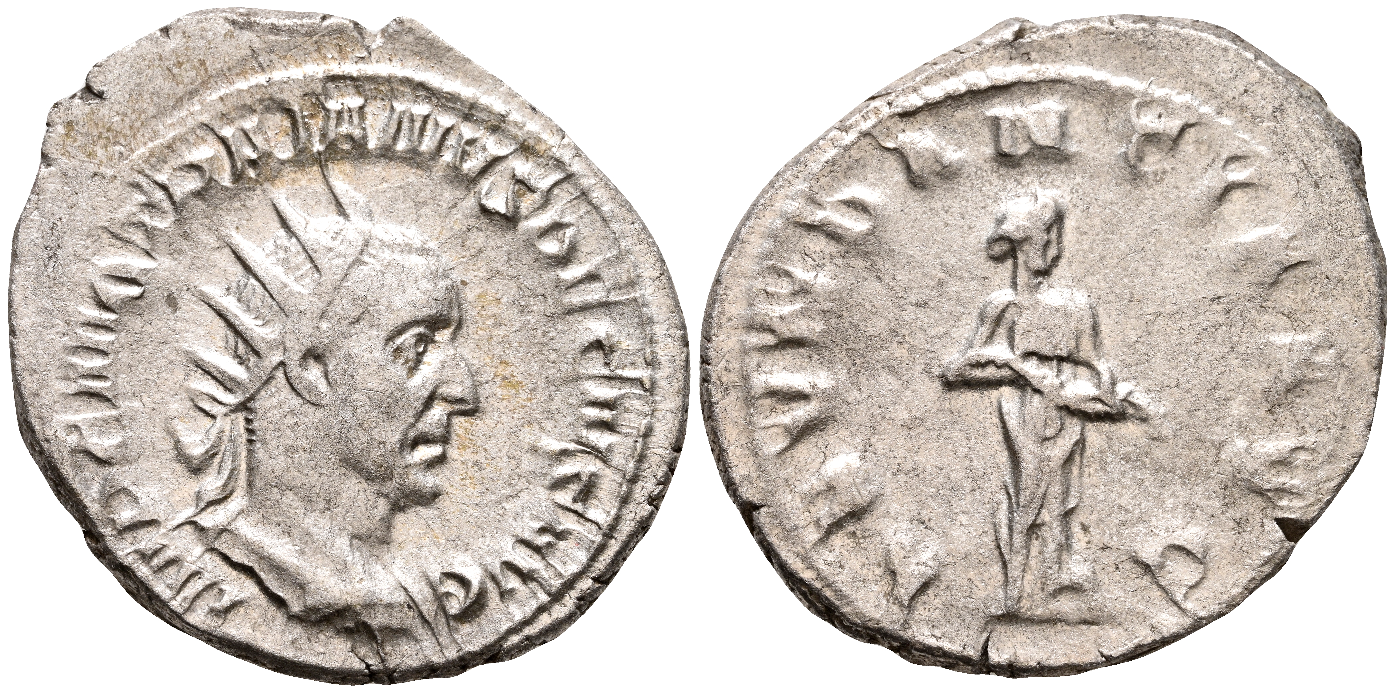 TRAJANO DECIO. Antoniniano. (Ar. 4,56g/25mm). 249-251 d.C. Roma. (RIC 10b). Anv: Busto radiado y drapeado de Trajano Decio a derecha, alrededor leyenda: IMP C M Q TRAIANVS DECIVS AVG. Rev: Abundantia estante a derecha vaciando cornucopia, alrededor leyenda: ABVNDANTIA AVG. MBC+/MBC.