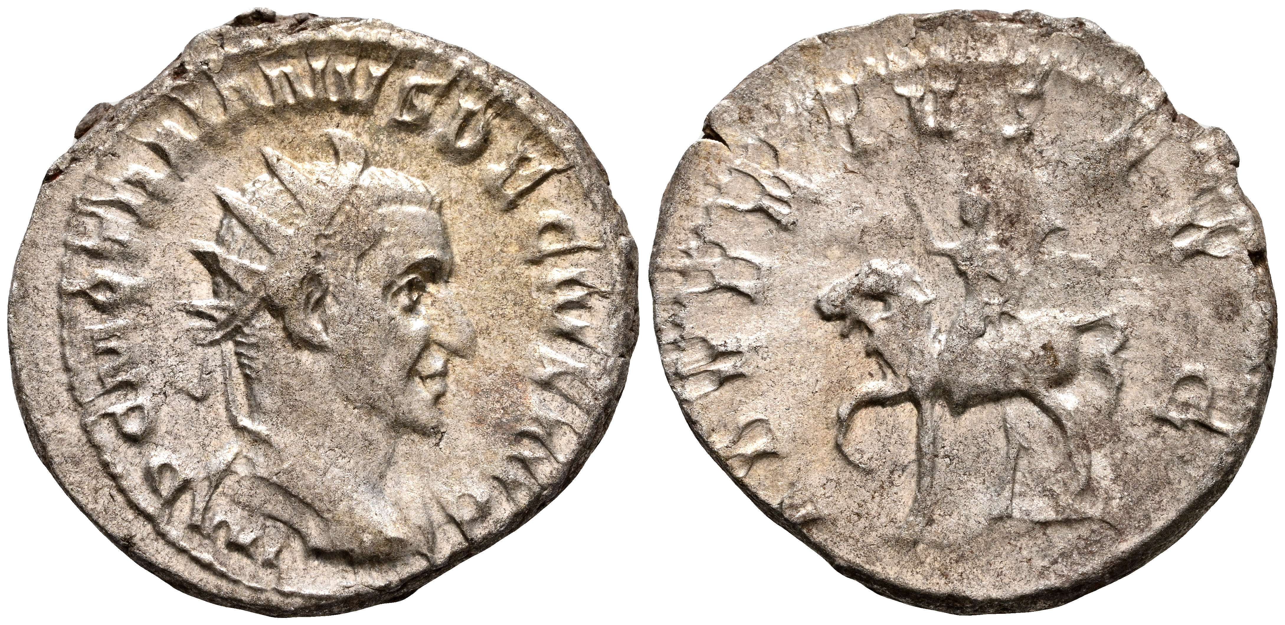 TRAJANO DECIO. Antoniniano. (Ar. 4,57g/23mm). 250-251 d.C. Roma. (RIC 11b). Anv: Busto radiado y drapeado a derecha de Trajano Decio, alrededor leyenda: IMP C M Q TRAIANVS DECIVS AVG. Rev: Trajano Decio con atuendo militar levantando mano derecha y portando lanza sobre caballo a izquierda, alrededor leyenda: ADVENTVS AVG. MBC+/MBC.
