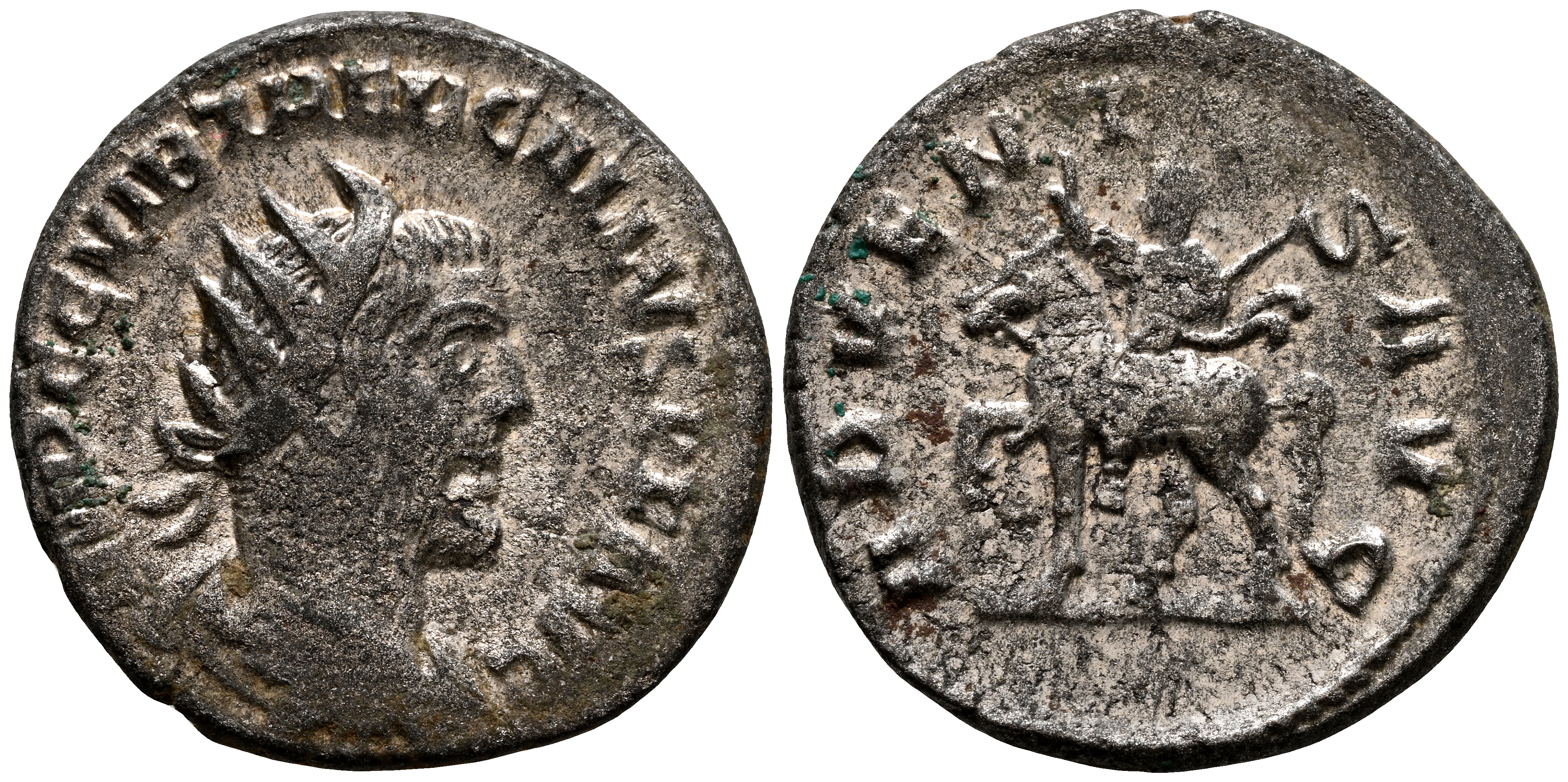TREBONIANO GALO. Antoniniano. (Ar. 4,14g/21mm). 252-253 d.C. Roma. (RIC 79). Anv: Busto radiado y drapeado de Treboniano Galo a derecha, alrededor leyenda: IMP C C VIB TREB GALLVS P F AVG. Rev: Treboniano Galo a caballo a izquierda portando cetro y alzando mano derecha, alrededor leyenda: ADVENTVS AVG. MBC.
