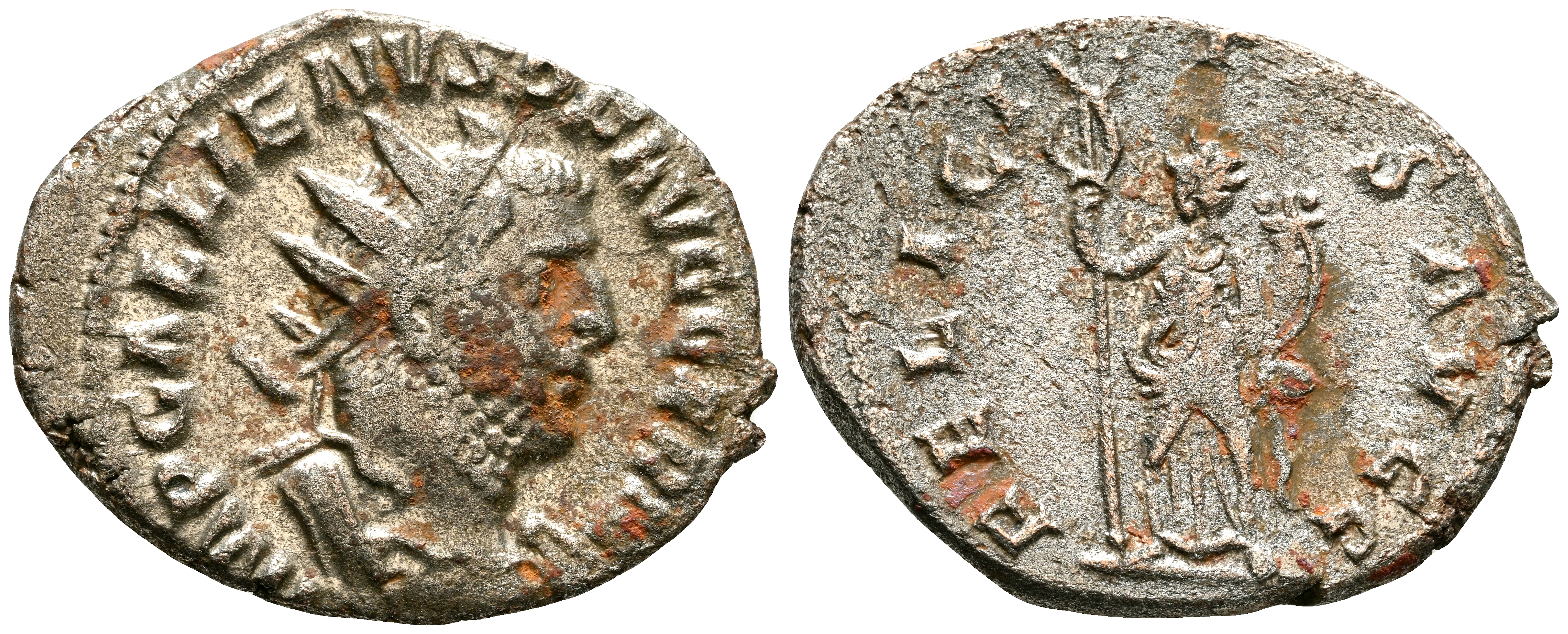 GALIENO. Antoniniano. (Ve. 2,65g/22mm). 256 d.C. Roma. (RIC 136). Anv: Busto radiado y con coraza de Galieno a derecha, alrededor leyenda: IMP GALLIENVS P F AVG GERM. Rev: Felicitas estante a izquierda portando caduceo y cornucopia, alrededor leyenda: FELICITAS AVGG. MBC. Restos de plateado original.