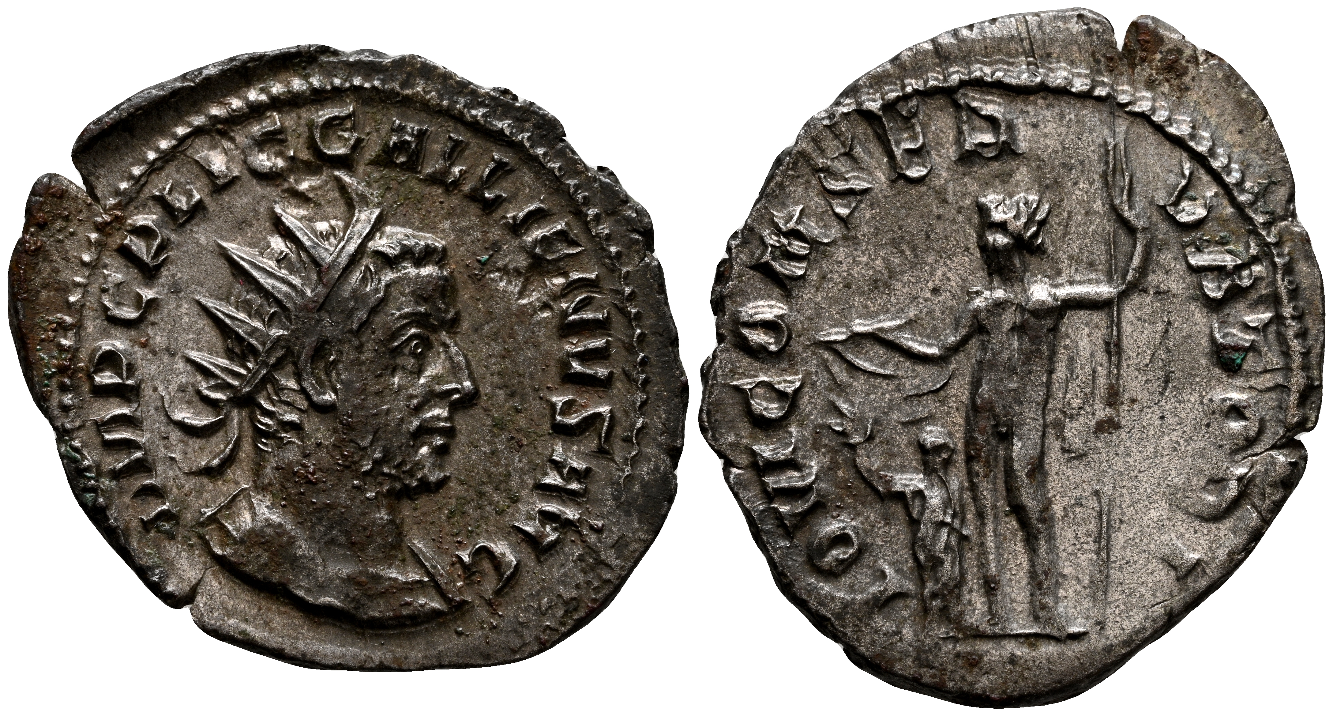 GALIENO. Antoniniano. (Ar. 2,76g/21mm). 254 d.C. Roma. (RIC 143). Anv: Busto radiado y drapeado de Galieno a derecha, alrededor leyenda: IMP C P LIC GALLIENVS AVG. Rev: Júpiter estante a izquierda portando patera y cetro, a sus pies Galieno togado con rama de olivo, alrededor leyenda: IOVI CONSERVATORI. MBC+.