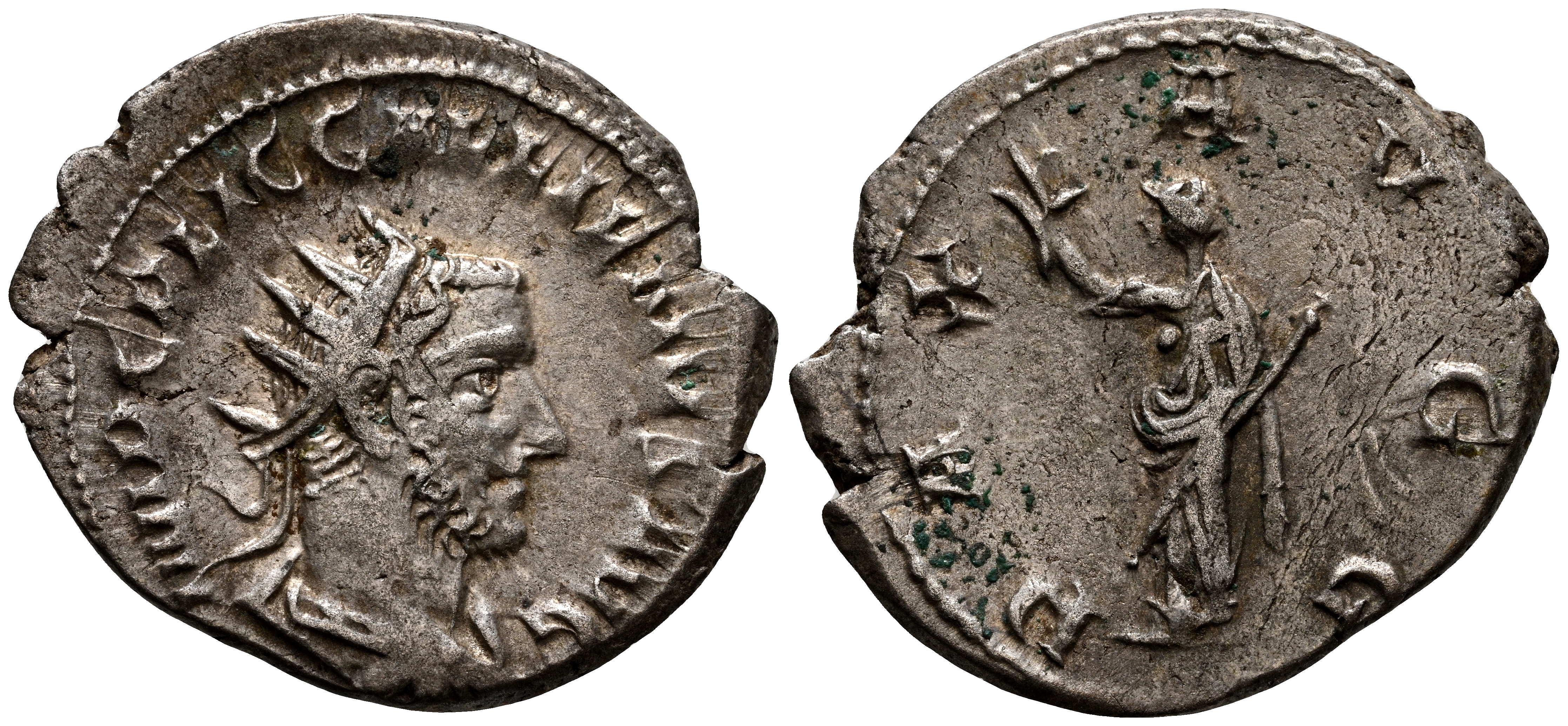 GALIENO. Antoniniano. (Ar. 3,08g/24mm). 253-254 d.C. Roma. (RIC 155). Anv: Busto radiado, drapeado y con coraza de Galieno a derecha, alrededor leyenda: IMP C P LIC GALLIENVS AVG. Rev: Pax estante a izquierda, sosteniendo rama de olivo y portando cetro, alrededor leyenda: PAX AVGG. MBC+. Concreciones en reverso. Bello tono.