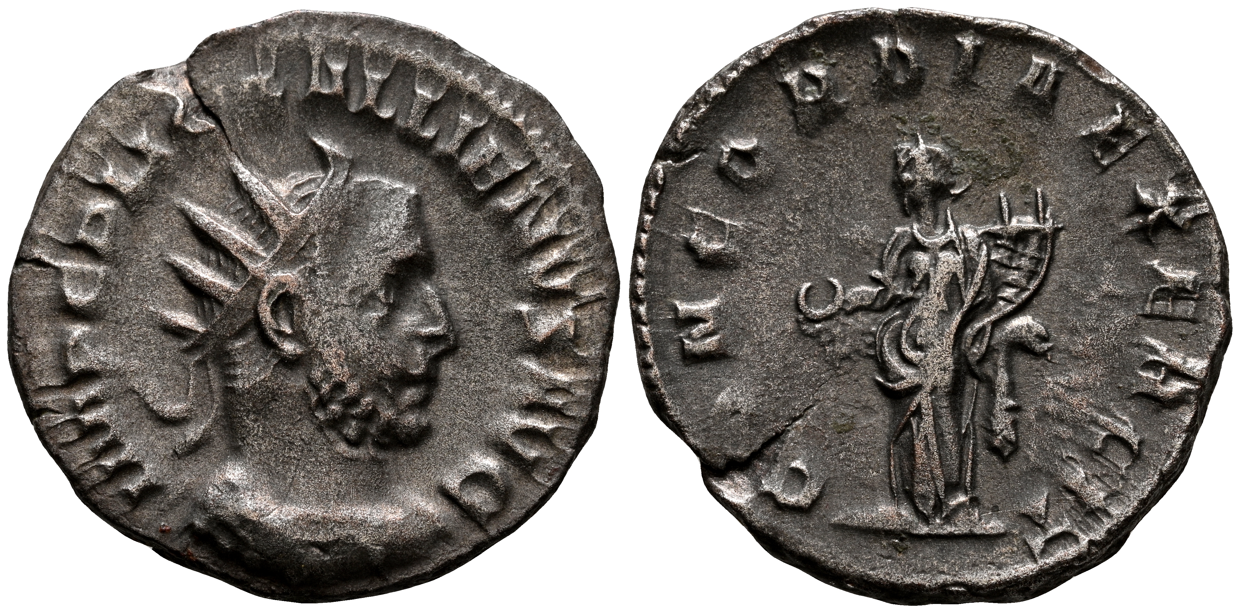 GALIENO. Antoniniano. (Ar. 3,35g/21mm). 254 d.C. Roma. (RIC 167). Anv: Busto radiado y drapeado de Galieno a derecha, alrededor leyenda: IMP C P LIC GALLIENVS AVG. Rev: Concordia estante a izquierda portando patera y doble cornucopia, alrededor leyenda: CONCORDIA EXERCIT. MBC+.