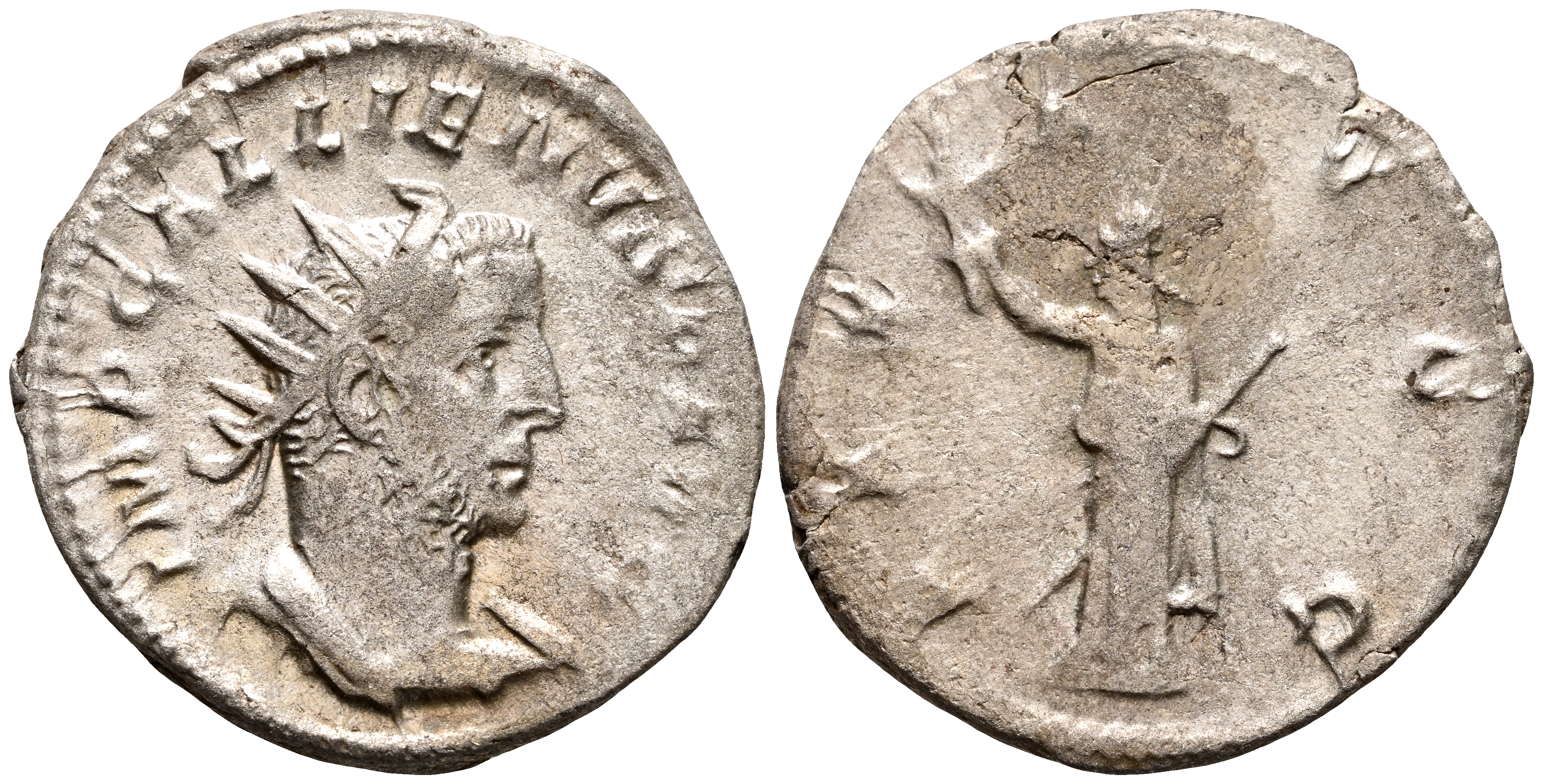 GALIENO. Antoniniano. (Ar. 2,88g/21mm). 254-255 d.C. Viminacium. (RIC 391). Anv: Busto radiado y drapeado de Galieno a derecha, alrededor leyenda: IMP GALLIENVS P AVG. Rev: Pax estante a izquierda portando rama y cetro, alrededor leyenda: PAX AVGG. MBC.