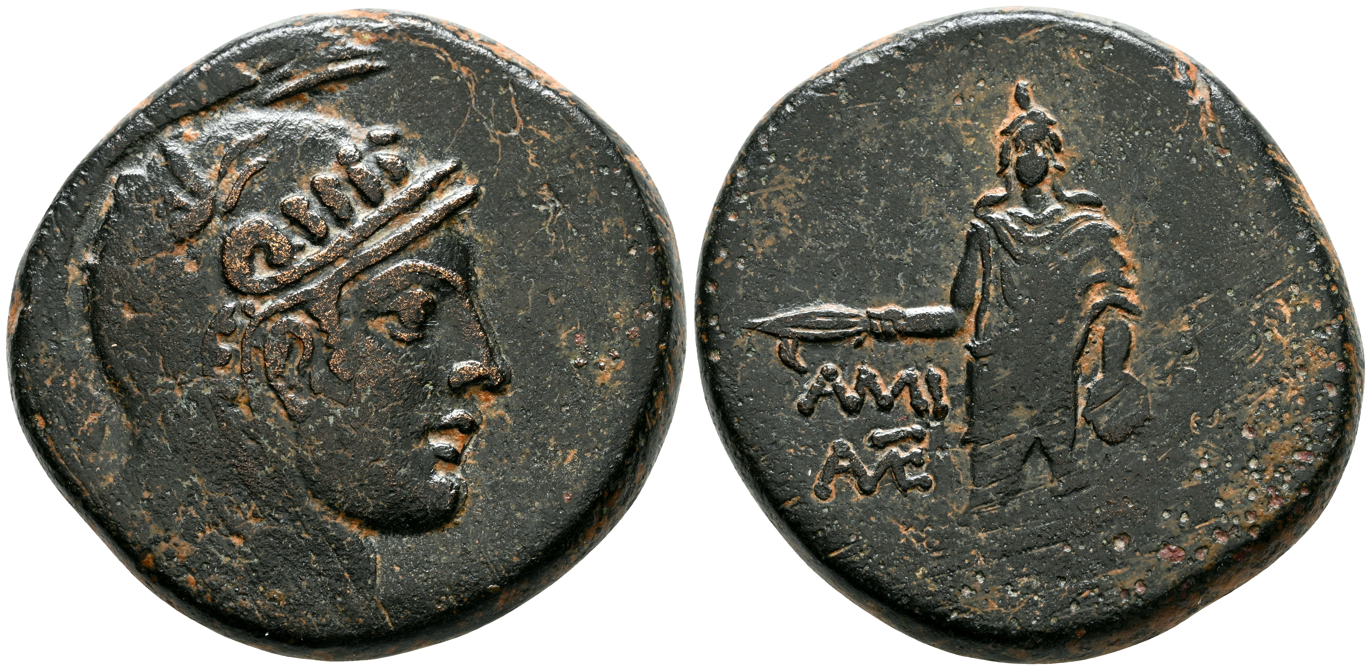 PONTOS, Amisos. Ae26. (Ae. 19,62g/29mm). 109-89 d.C. (SNG BM 1176). Anv: Cabeza con casco de Atenea a derecha. Rev: Perseo estante a izquierda sosteniendo arpa y cabeza de Medusa, cuyo cuerpo decapitado yace a sus pies, en campo: AMI-ΣOY y m onograma s. MBC.