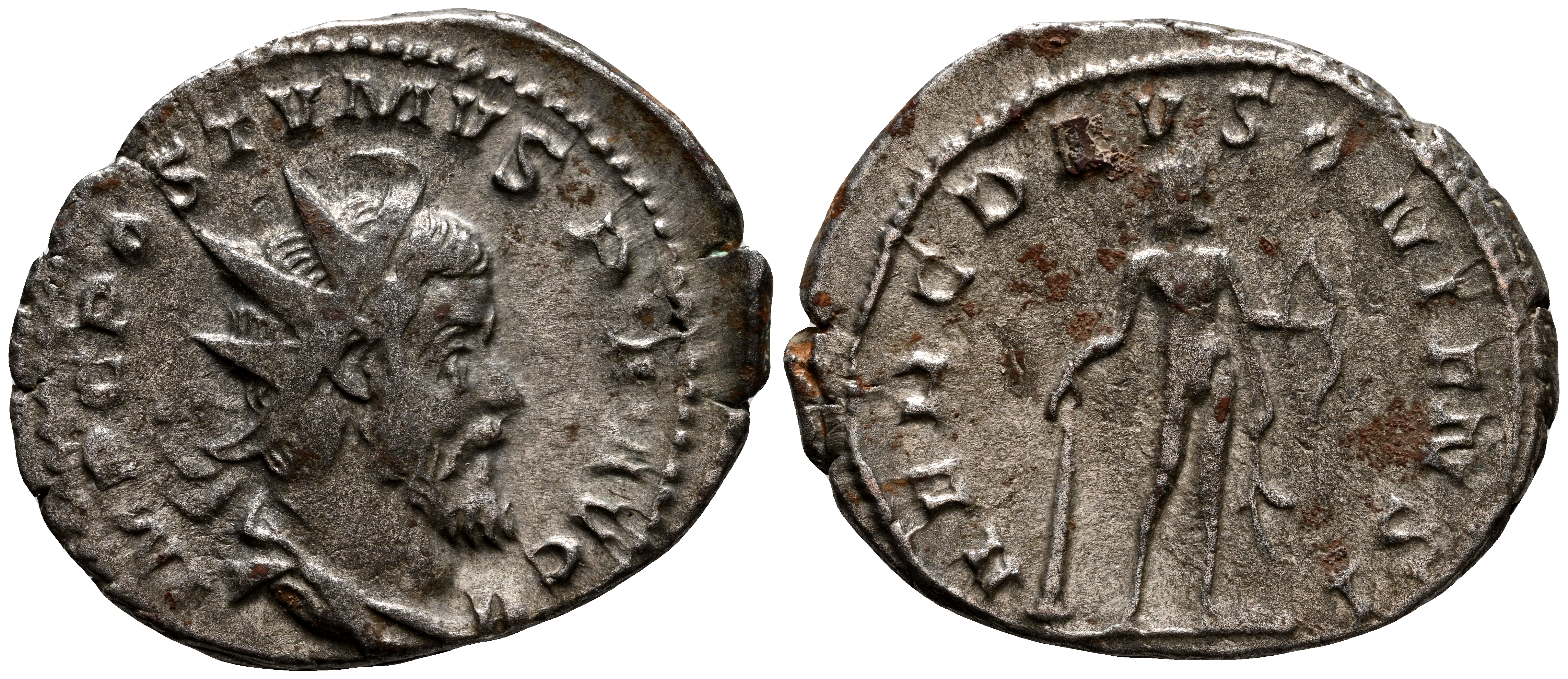 POSTUMO. Antoniniano. (Ar. 3,61g/24mm). 260-261 d.C. Treveri. (RIC 64). Anv: Busto radiado y drapeado de Póstumo a derecha, alrededor leyenda: IMP C POSTVMVS P F AVG. Rev: Hércules estante a derecha apoyado sobre mazo y portando arco y piel de león, alrededor leyenda: HERC DEVSONIENSI. MBC.