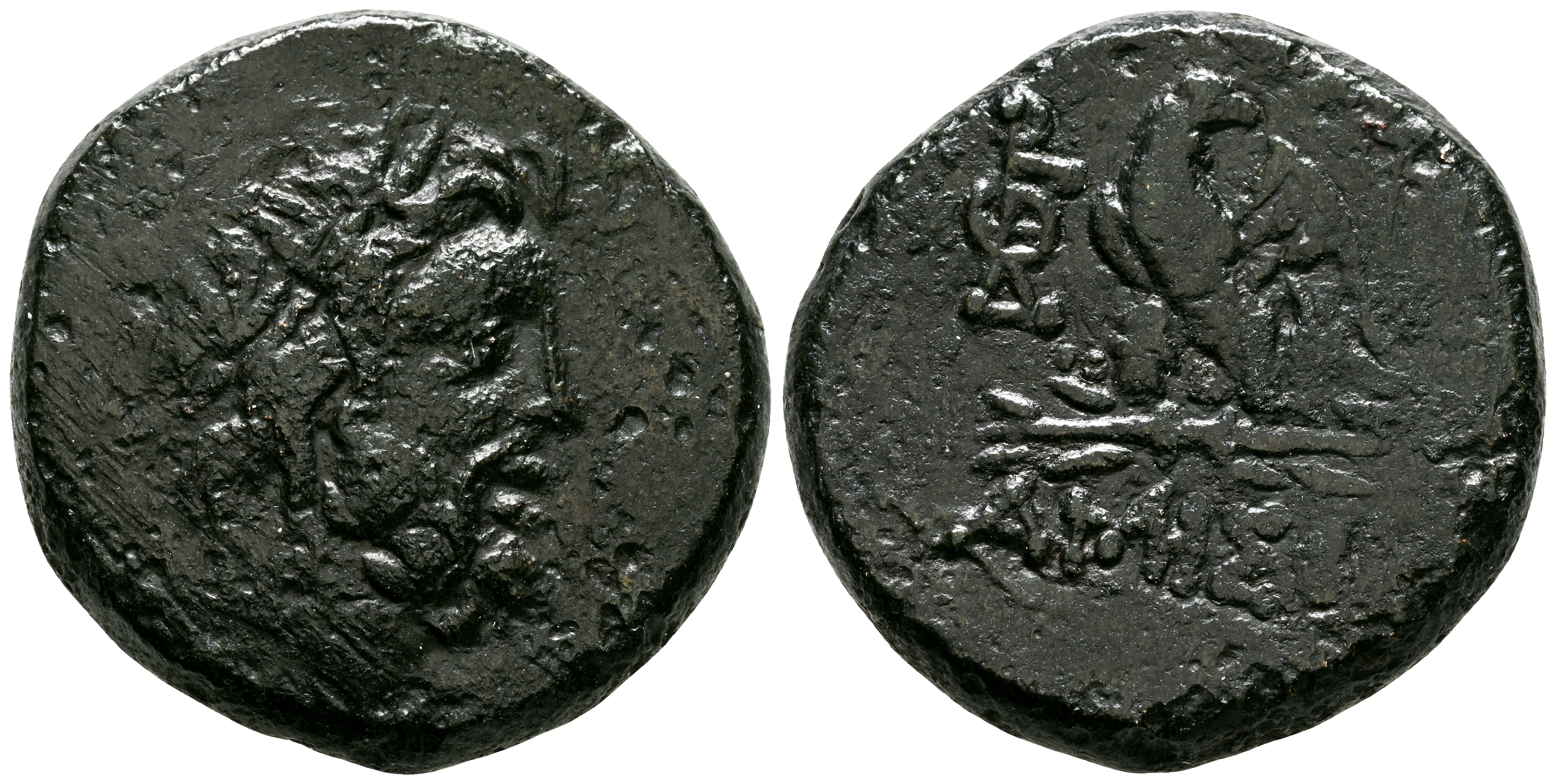 PONTOS, Amisos. Ae20. (Ae. 8,75g/20mm). 85-65 d.C. (Emisión cívica bajo Mithradates VI Eupator). (HGC 7, 421). Anv: Cabeza laureada de Zeus a la derecha. Rev: Aguila estante a izquierda mirando a derecha sobre un rayo, monograma en el campo, en exerg o: AMIΣOY. MBC.