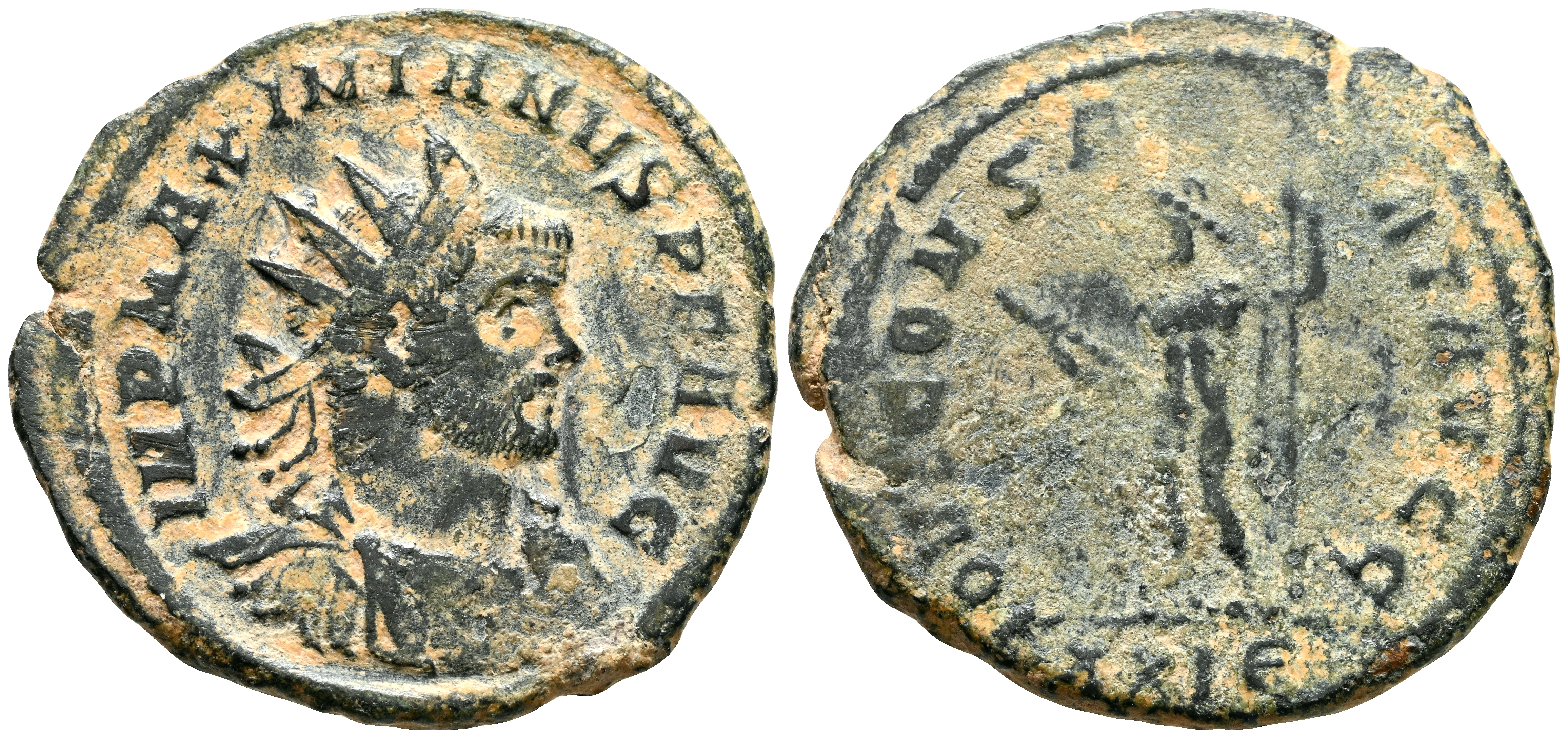 MAXIMIANO HERCULEO. Antoniniano. (Ae. 4,10g/24mm). 286 d.C. (RIC 506). Rev: Busto radiado, drapeado y con coraza de Maximiano Herculeo a derecha, alrededor leyenda: IMP MAXIMIANVS PF AVG. Rev: Genio estante derecha portando haz de rayos y cetro, en exergo: XXIB, alrededor leyenda: IOVI CONSERVAT AVG. MBC-.