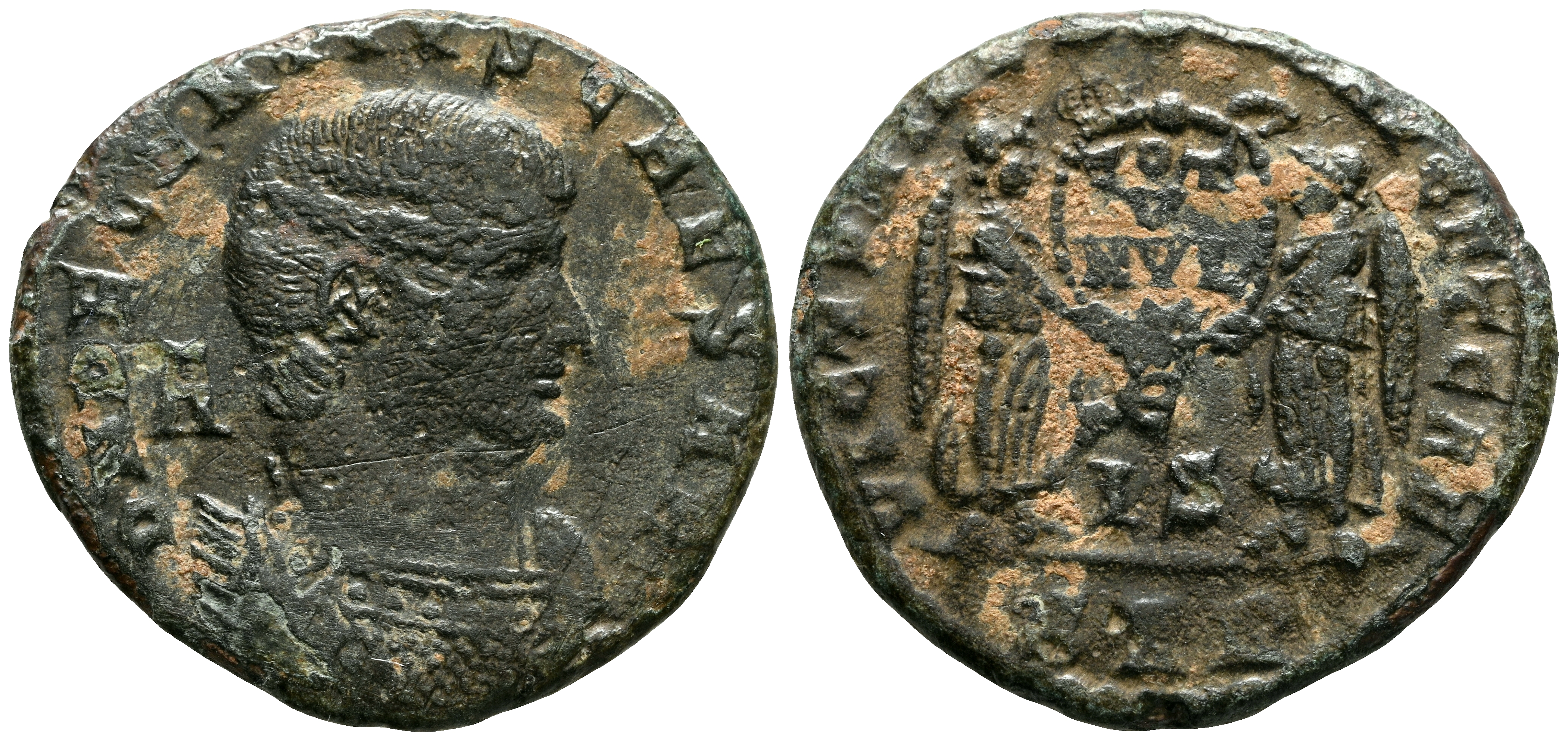 DECENCIO. Follis. (Ae. 3,35g/21mm). 351-352 d.C. Arles. (RIC 180). Anv: Busto drapeado de Decencio a derecha, detrás: A, alrededor leyenda: D N DECENTIVS CAESAR. Rev: Dos Victorias enfrentadas portando escudo con inscripción: VOT/V/MVLT/X, entre E/IS, en exergo: PAR, alrededor leyenda: VICTORIAE D D N N AVG ET CAES. MBC-/MBC.
