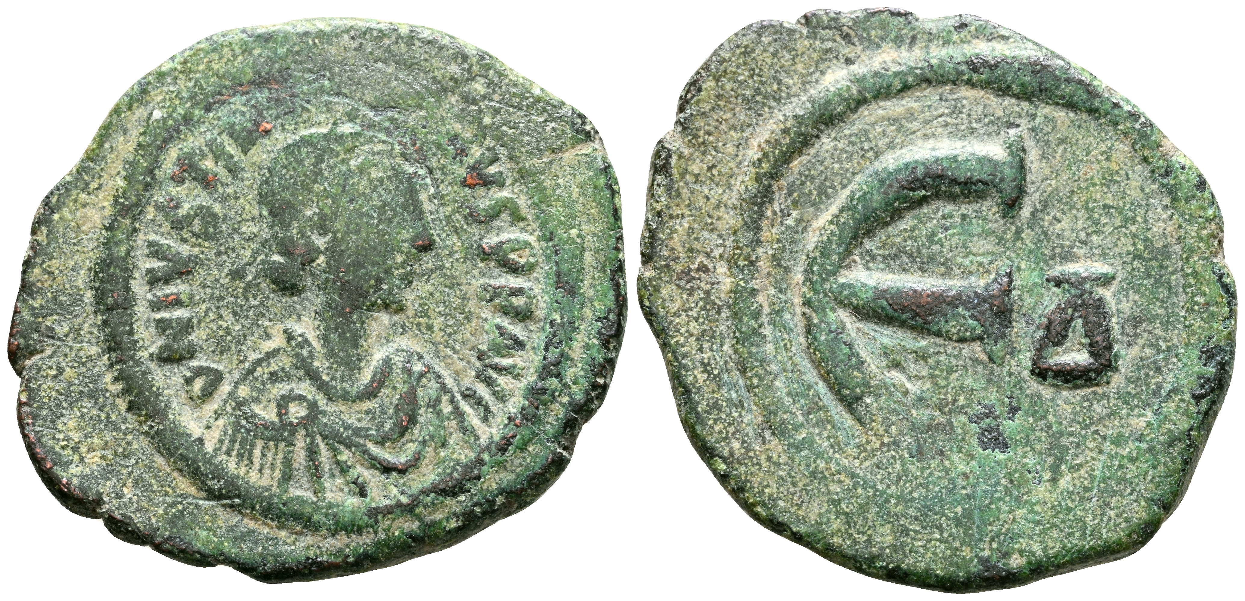 JUSTINIANO I. Pentanummium. (Ae. 3,16g/23mm). 537-551 d.C. Antioquía. (Seaby 241). Anv: Busto diademado y drapeado de Justiniano I a derecha, alrededor leyenda: DN IVSTINVS PP AVG. Rev: E grande con cruz en el centro, a la derecha letra A. MBC.
