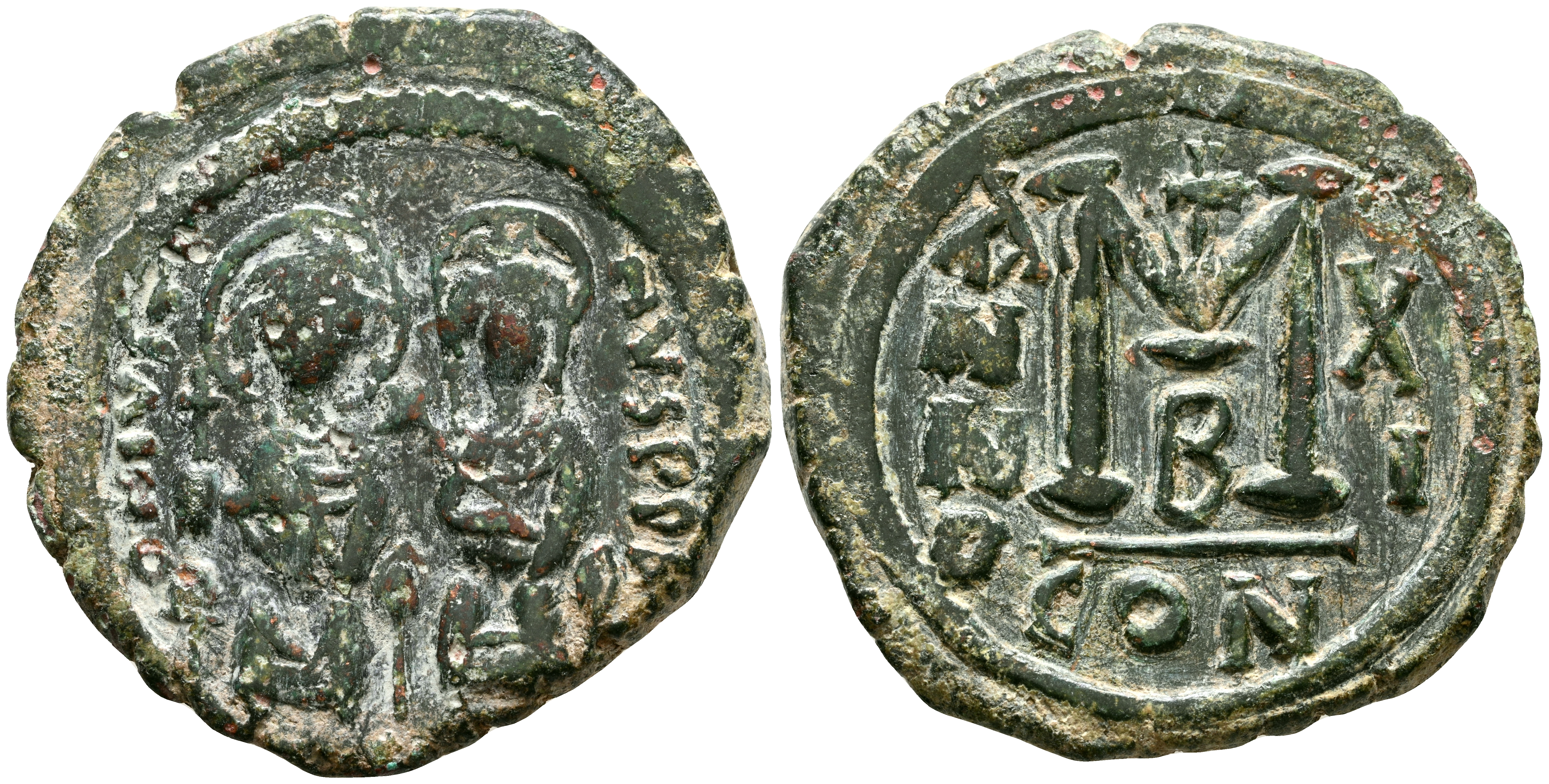 JUSTINO II Y SOFIA. Follis. (Ae. 13,38g/32mm). 575-576 d.C. (Año 10). Constantinopla. (Seaby 360). Anv: Justiniano II y Sofía coronados portando globo crucífero y cetro respectivamente, sentados de frente, alrededor leyenda. Rev: M grande, encima cruz, debajo B, entre: ANNO-XI, en exergo: CON. MBC-/MBC.
