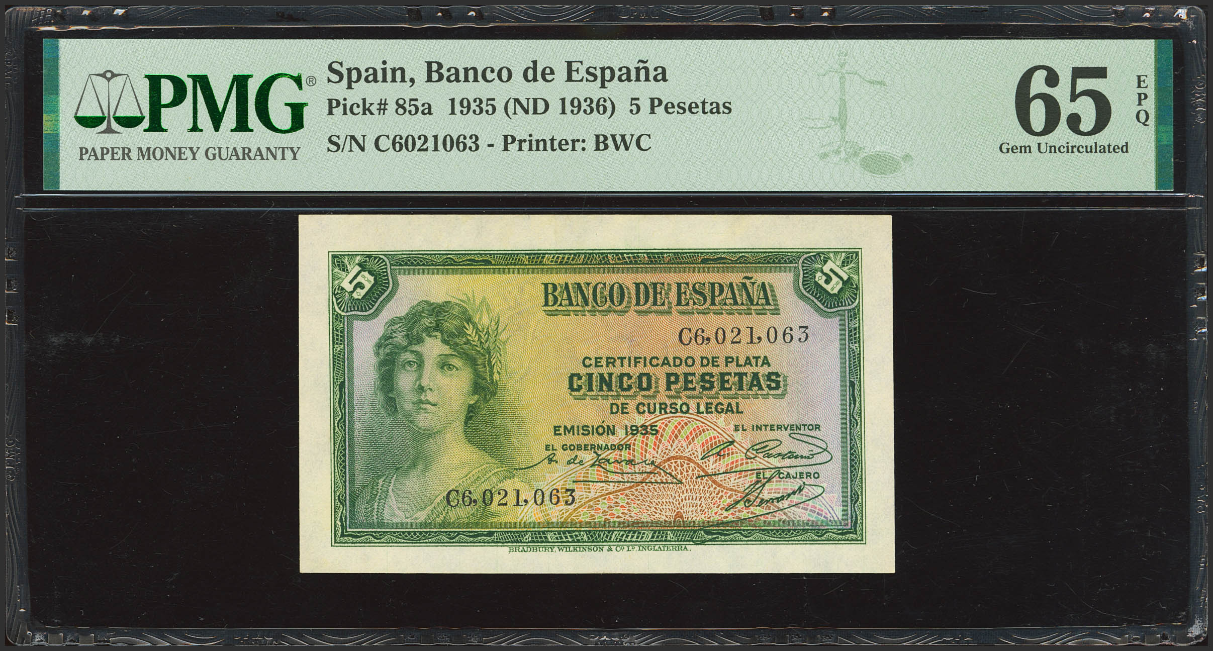 5 Pesetas. 1935. Certificado de Plata. Serie C. (Edifil 2023: 363a, Pick: 85a). Inusual en esta excepcional calidad, apresto original. SC. Encapsulado PMG65EPQ.
