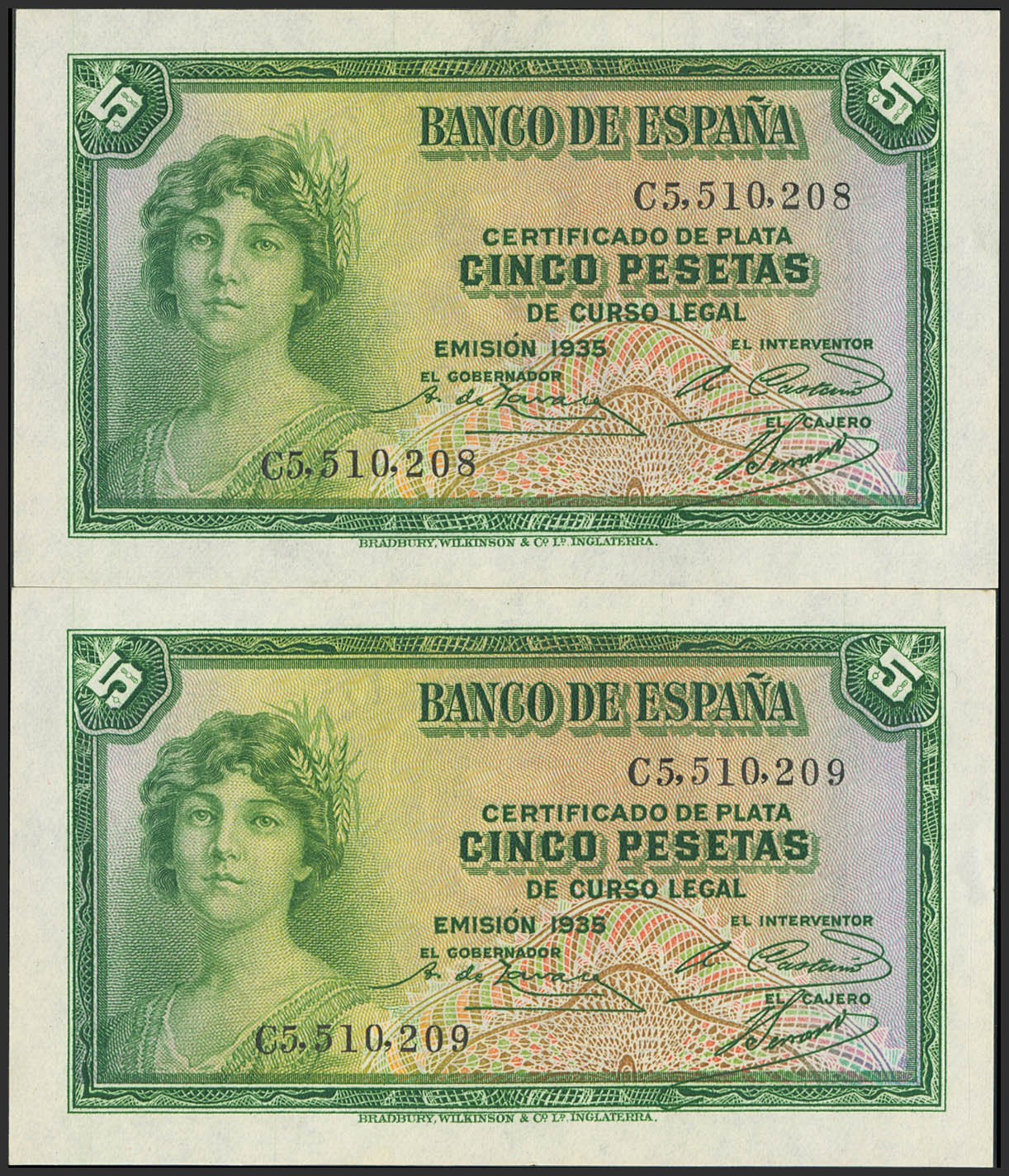 5 Pesetas. 1935. Certificado de Plata. Pareja correlativa. Serie C. (Edifil 2023: 363a). Apresto original. SC-.