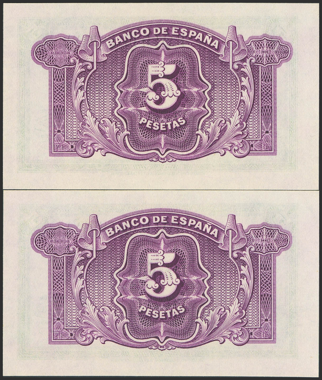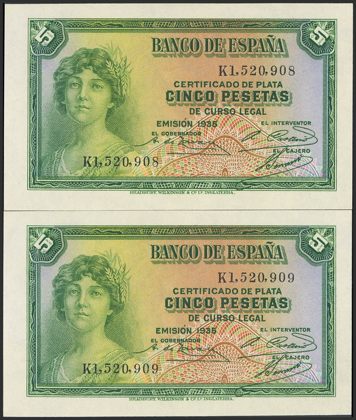 5 Pesetas. 1935. Certificado de Plata. Pareja correlativa. Serie K. (Edifil 2023: 363b). Apresto original. SC.