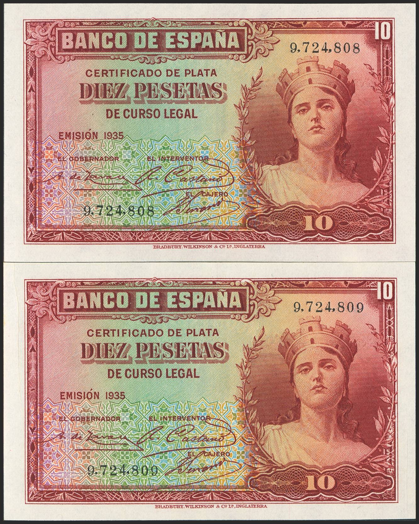 10 Pesetas. 1935. Certificado de Plata. Pareja correlativa. Sin serie. (Edifil 2023: 364). Apresto original. SC.