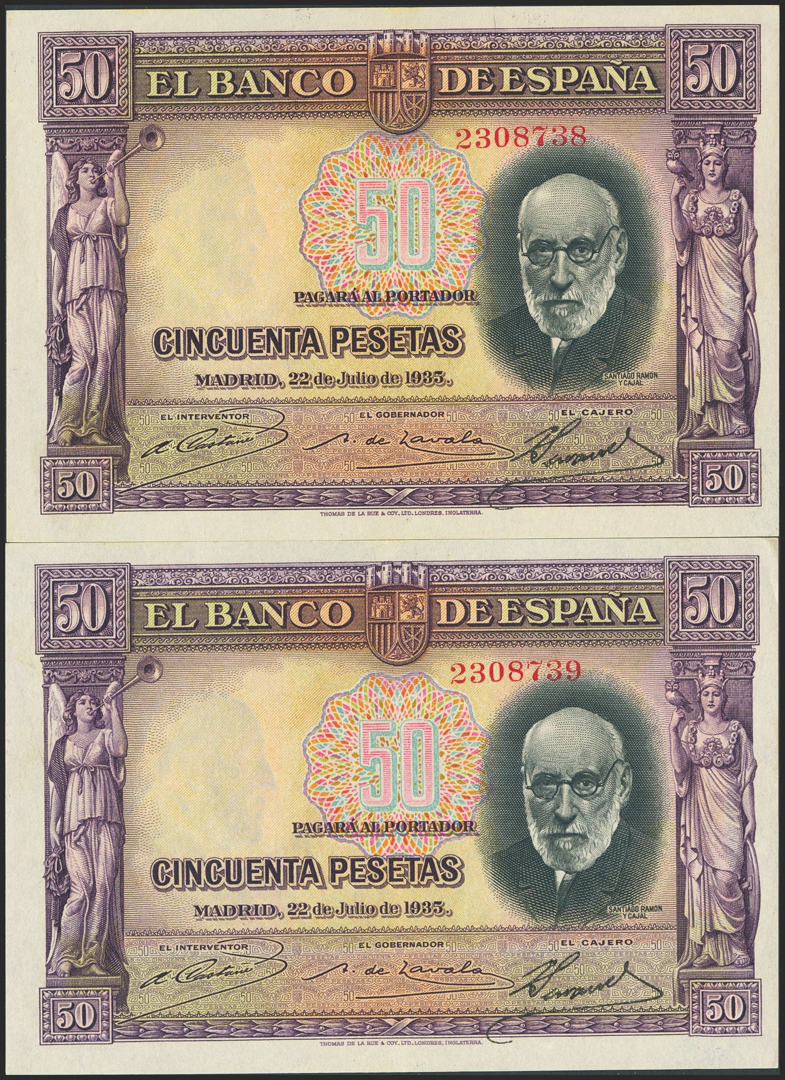 50 Pesetas. 22 de Julio de 1935. Pareja correlativa. Sin serie. (Edifil 2023: 366). Conserva gran parte de su apresto original. EBC++.