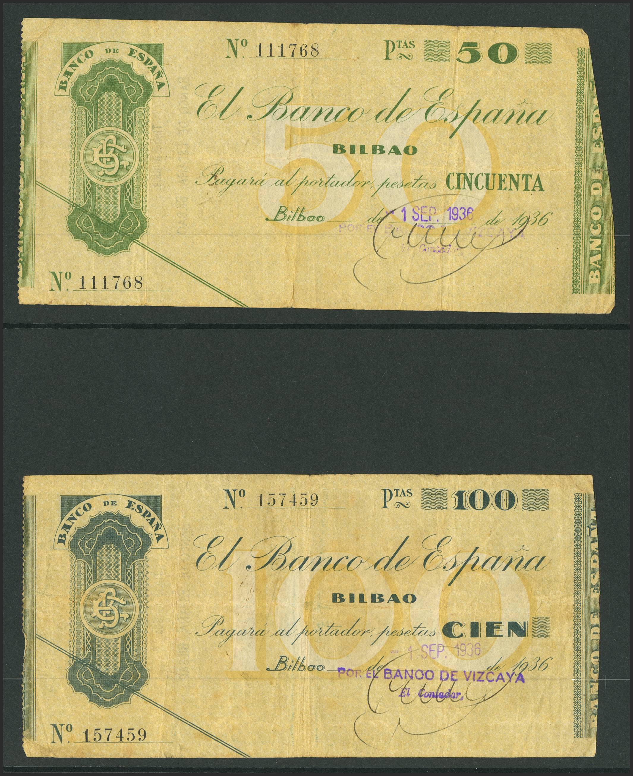 Serie completa de 4 billetes del Banco de Bilbao, al falta del 5 pts sin serie, emitidos en 1936 incluyendo el 5 Pesetas, 25 Pesetas, 50 Pesetas y 100 Pesetas, con las antefirmas Banco de Vizcaya y Caja de Ahorros y Monte de Piedad Municipal de Bilbao (Edifil 2023: 368Aa, 369j, 370a, 371b). MBC-/BC+.