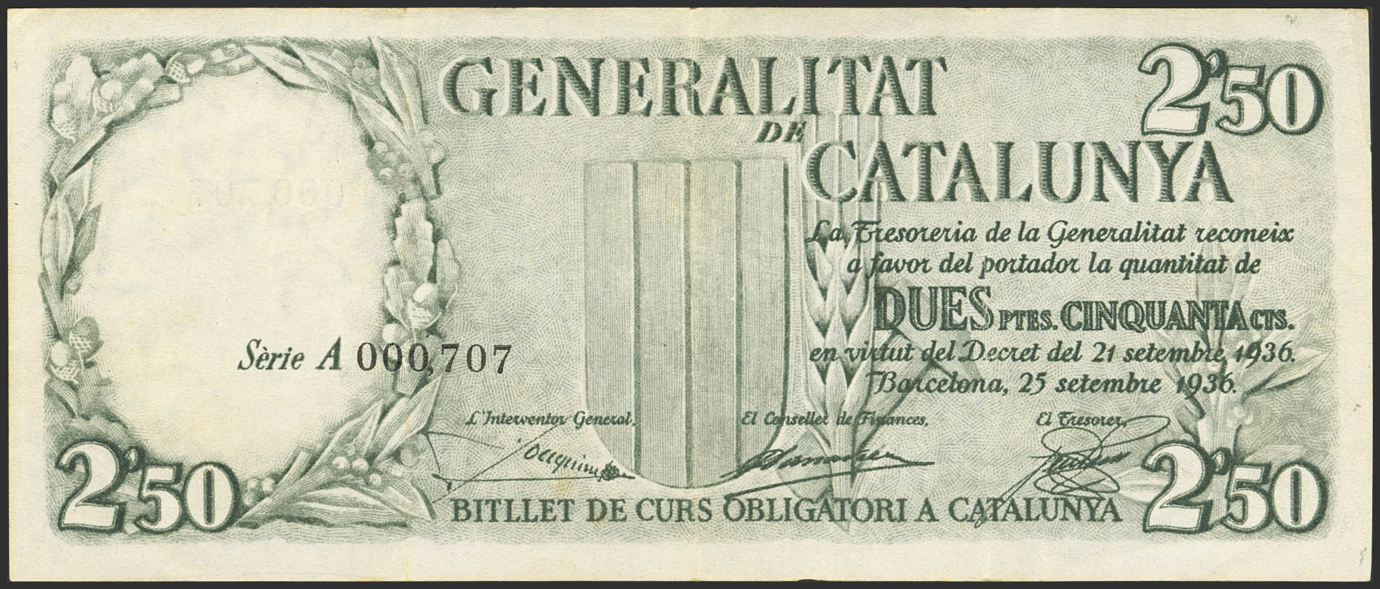 2´50 Pessetes. 25 de Septiembre de 1936. Generalitat de Catalunya. Serie A y numeración bajísima (000707). (Edifil 2023: 372). MBC+.