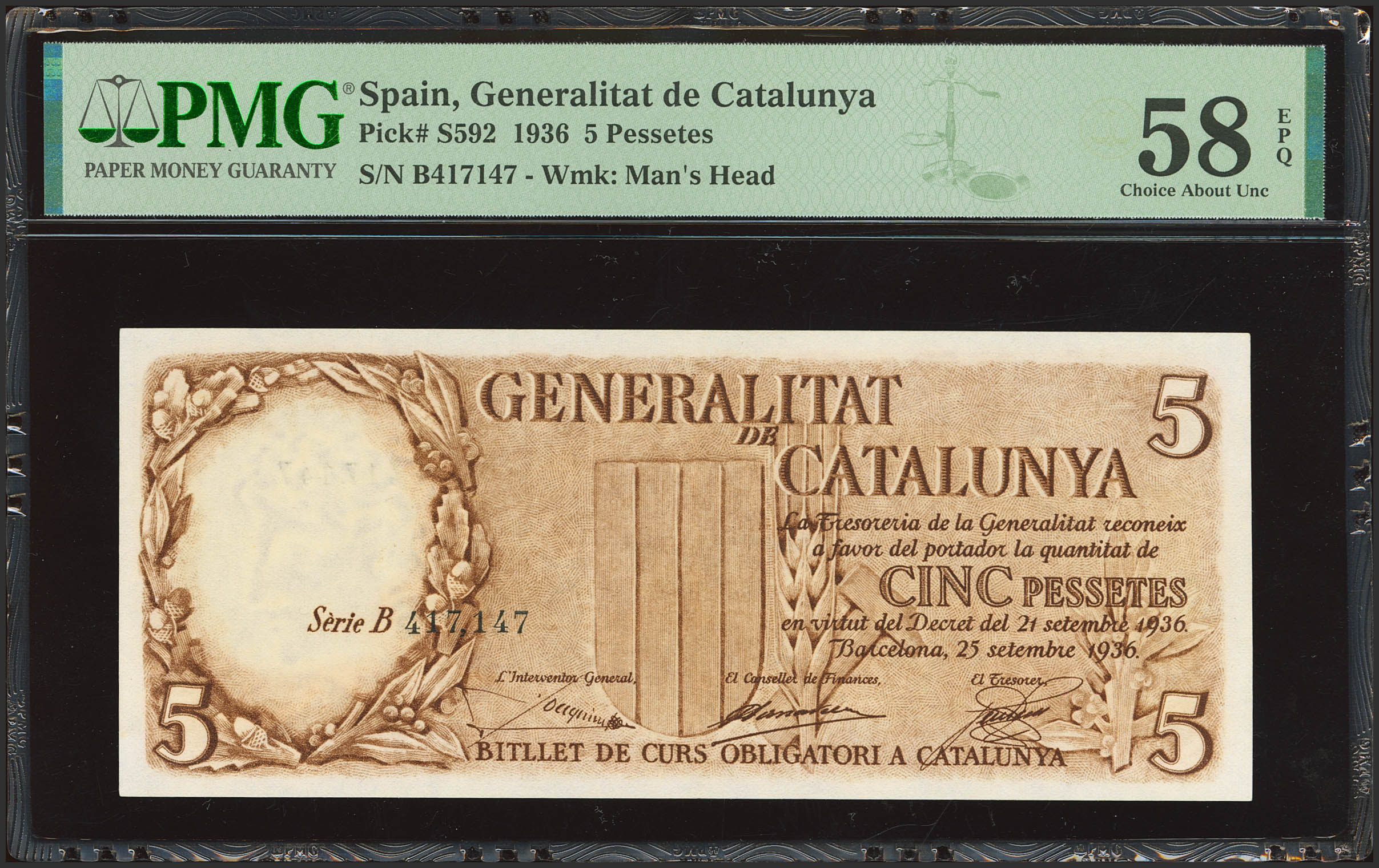 5 Pessetes. 25 de Septiembre de 1936. Serie B. (Edifil 2023: 373, Pick: S592). EBC+. Encapsulado PMG58. (para hacernos idea de la rareza, a fecha 1 de Abril de 2026, este billete es el cuarto mejor calificado junto a otro billete en PMG)
