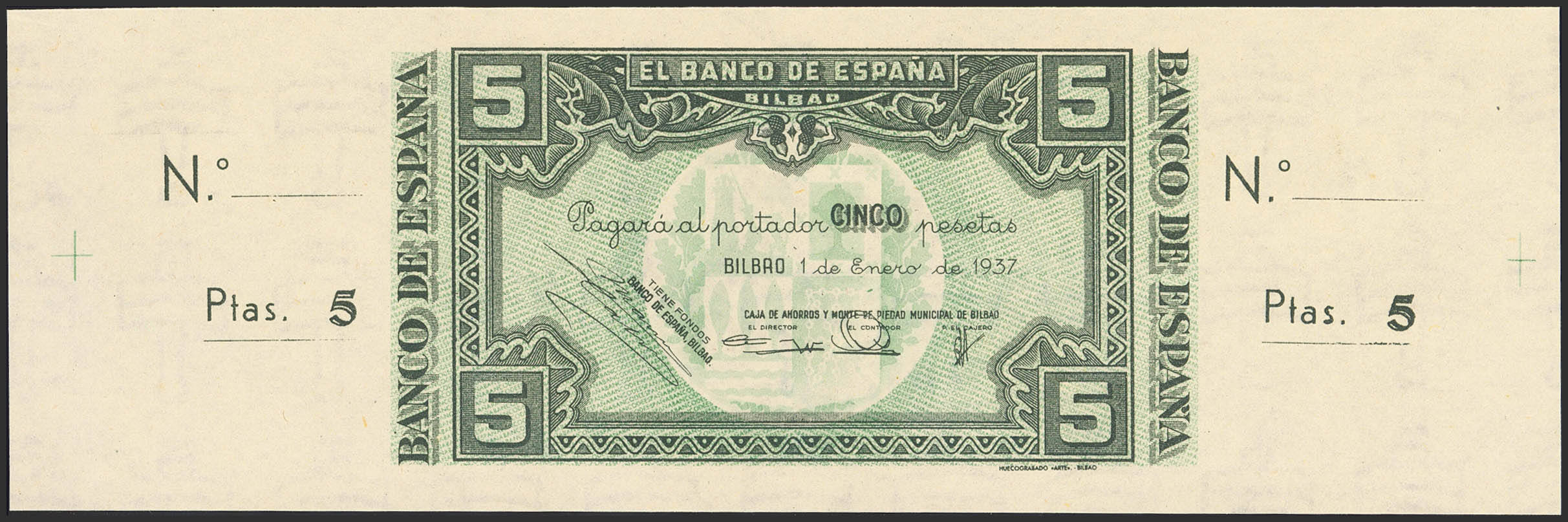 5 Pesetas. 1 de Enero de 1937. Sucursal de Bilbao, antefirma Caja de Ahorros y Monte de Piedad Municipal de Bilbao. Sin serie y sin numeración, con ambas matrices. (Edifil 2023: 385a). Apresto original. SC.