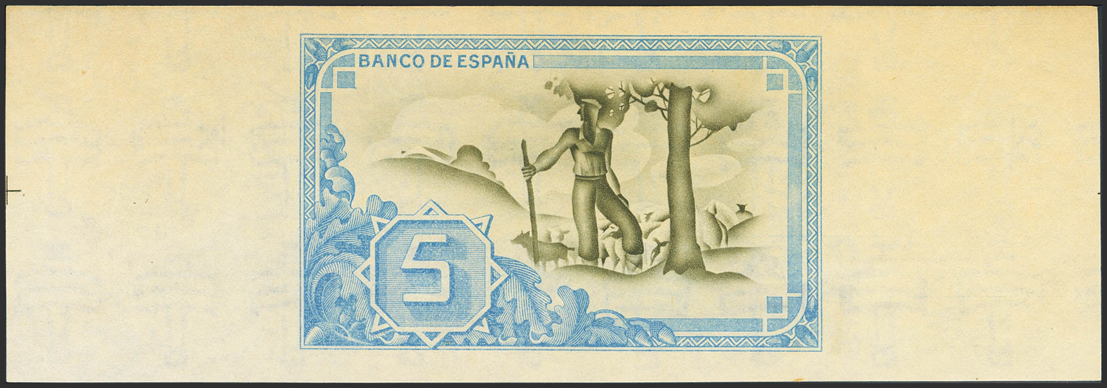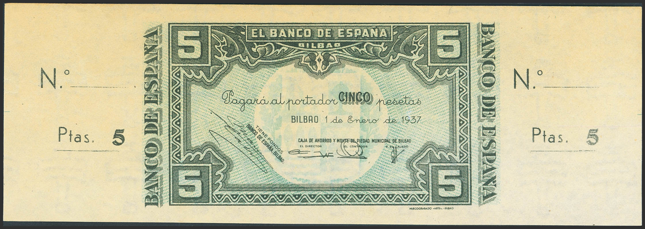 5 Pesetas. 1 de Enero de 1937. Sucursal de Bilbao, antefirma Caja de Ahorros y Monte de Piedad Municipal de Bilbao. Sin serie y sin numeración, con ambas matrices. (Edifil 2023: 385a). Apresto original, tonalizado. SC-.