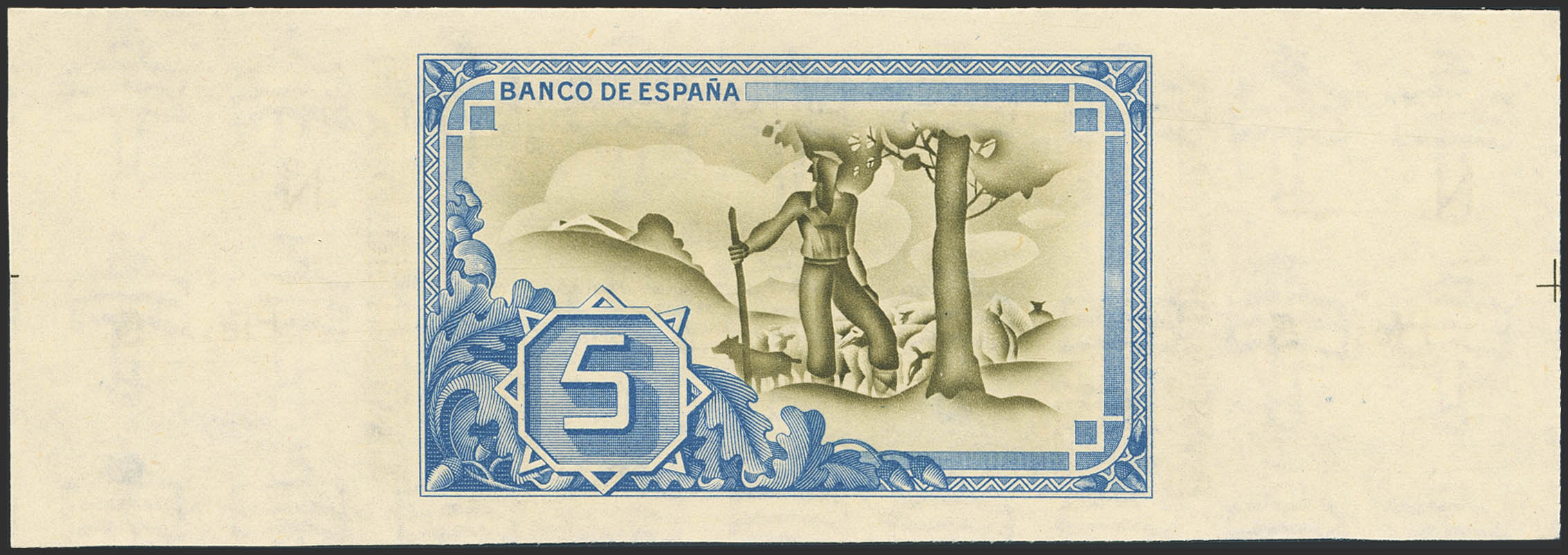 5 Pesetas. 1 de Enero de 1937. Sucursal de Bilbao, antefirma Banco de Bilbao. Sin serie y sin numeración, con ambas matrices. (Edifil 2023: 385c). Apresto original. SC.