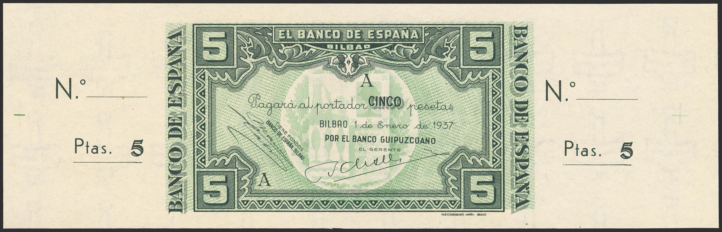 5 Pesetas. 1 de Enero de 1937. Sucursal de Bilbao, antefirma Banco Guipuzcoano. Serie A y sin numeración, con ambas matrices. (Edifil 2023: 386c). Apresto original. SC.