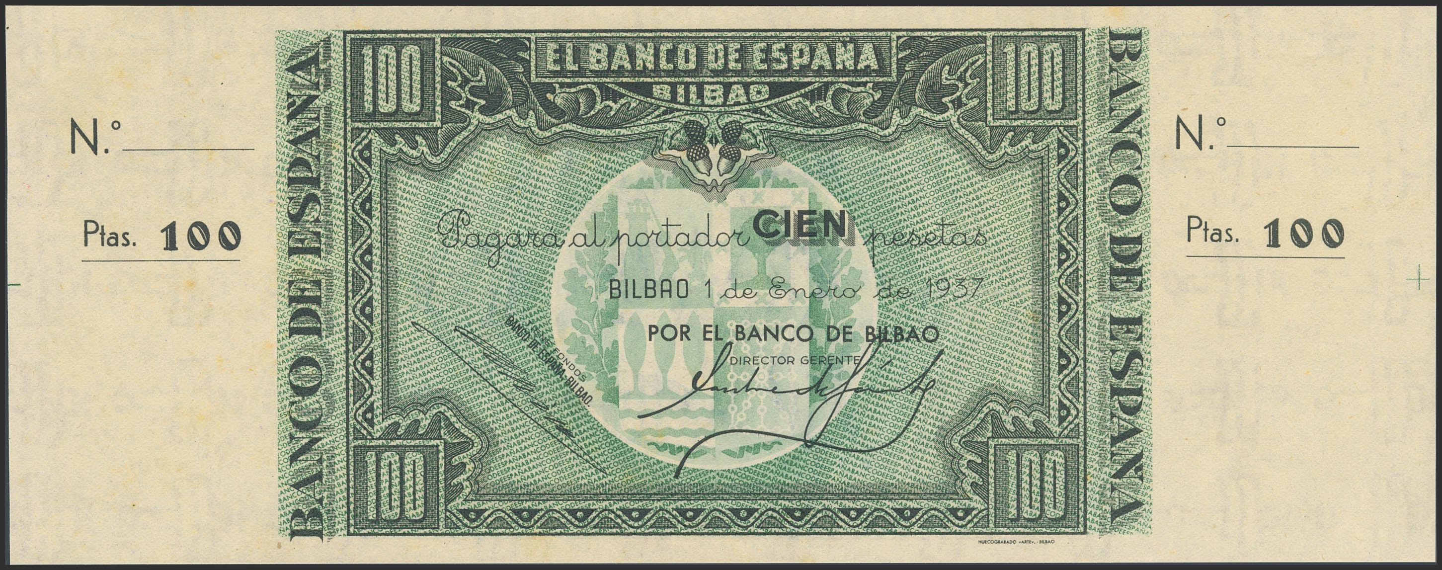 100 Pesetas. 1 de Enero de 1937. Sucursal de Bilbao, antefirma Banco de Bilbao. Sin serie y sin numeración, con ambas matrices. (Edifil 2023: 390a). Apresto original, puntitos del tiempo. SC-.