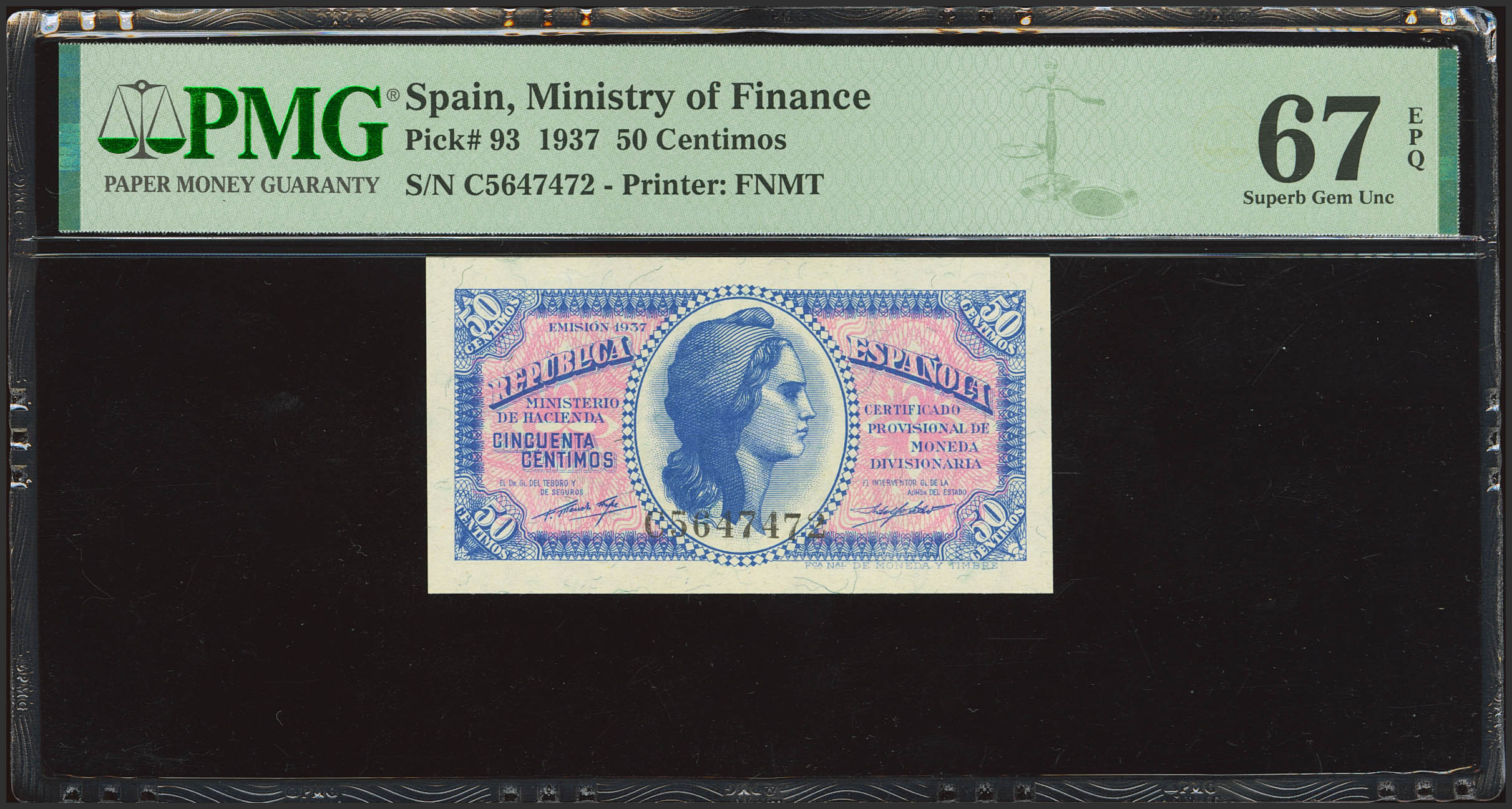 50 Céntimos. 1937. Serie C, última serie emitida. (Edifil 2023: 391a, Pick: 93). Apresto original. SC. Encapsulado PMG67EPQ.