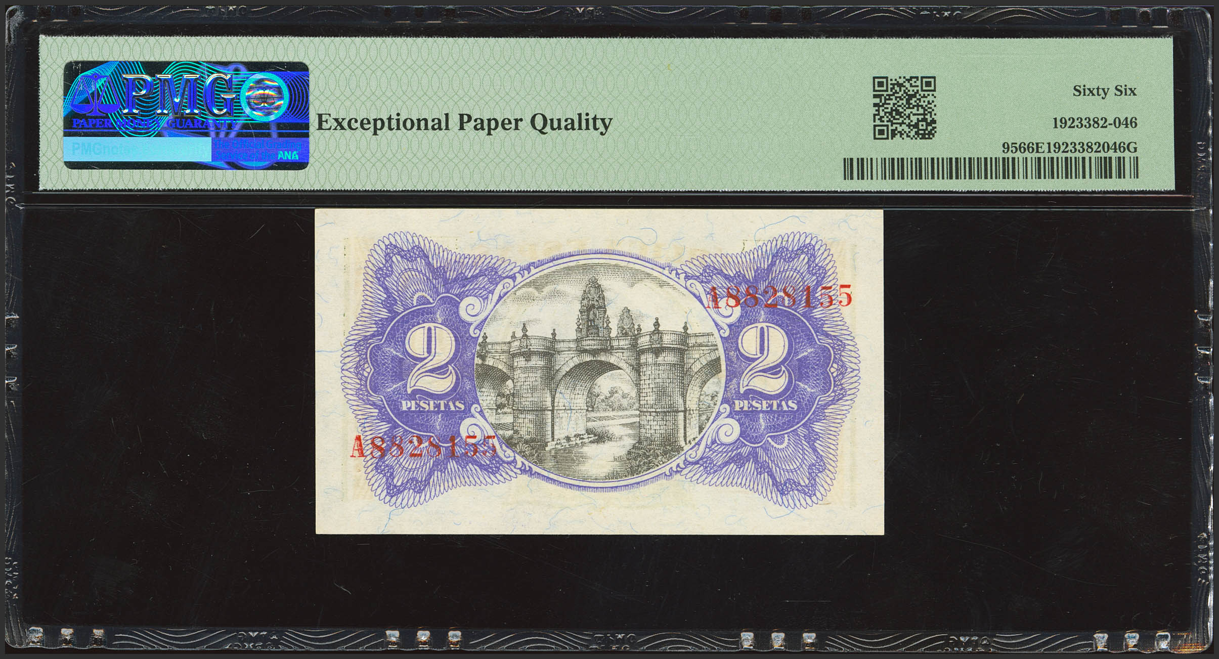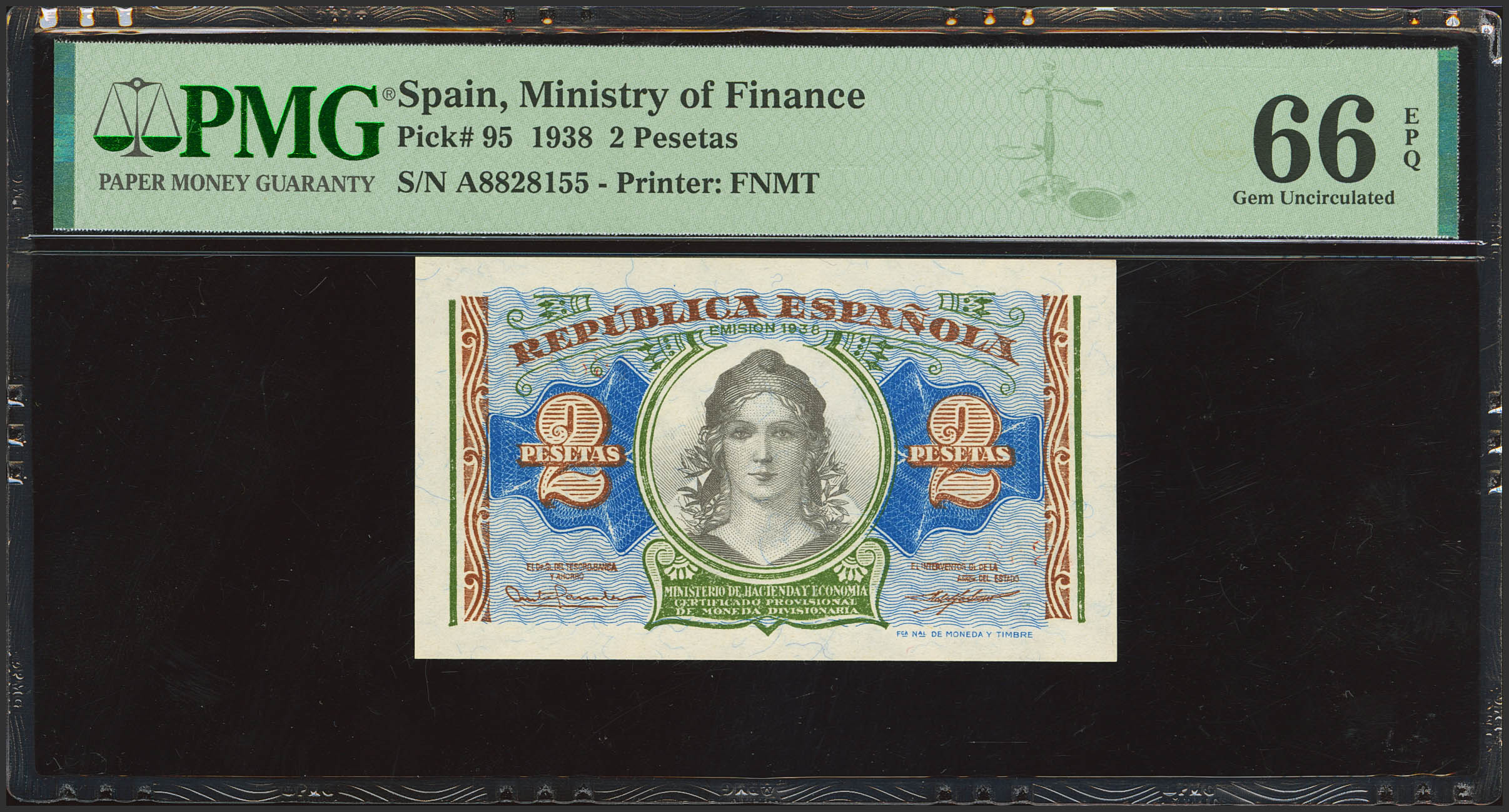 2 Pesetas. 1938. Serie A. (Edifil 2023: 393, Pick: 95). Apresto original. SC. Encapsulado PMG66EPQ.