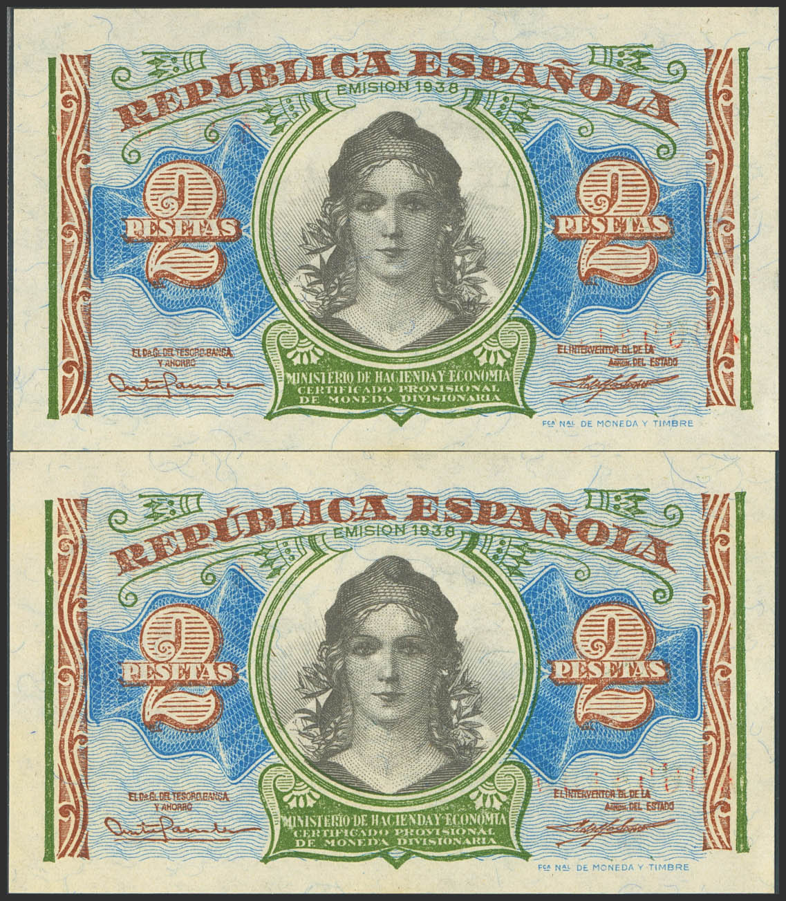 2 Pesetas. 1938. Pareja correlativa. Serie A. (Edifil 2023: 393). Apresto original. SC.