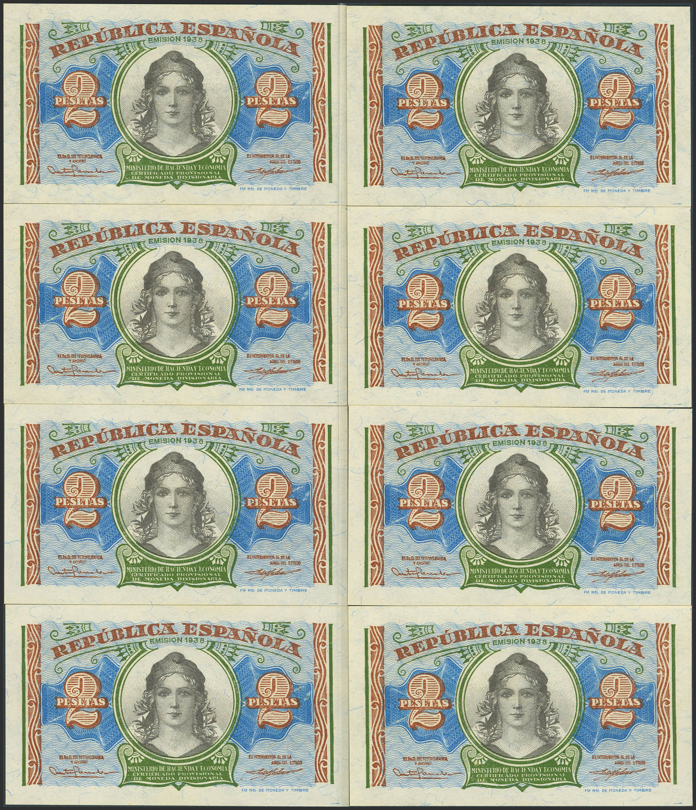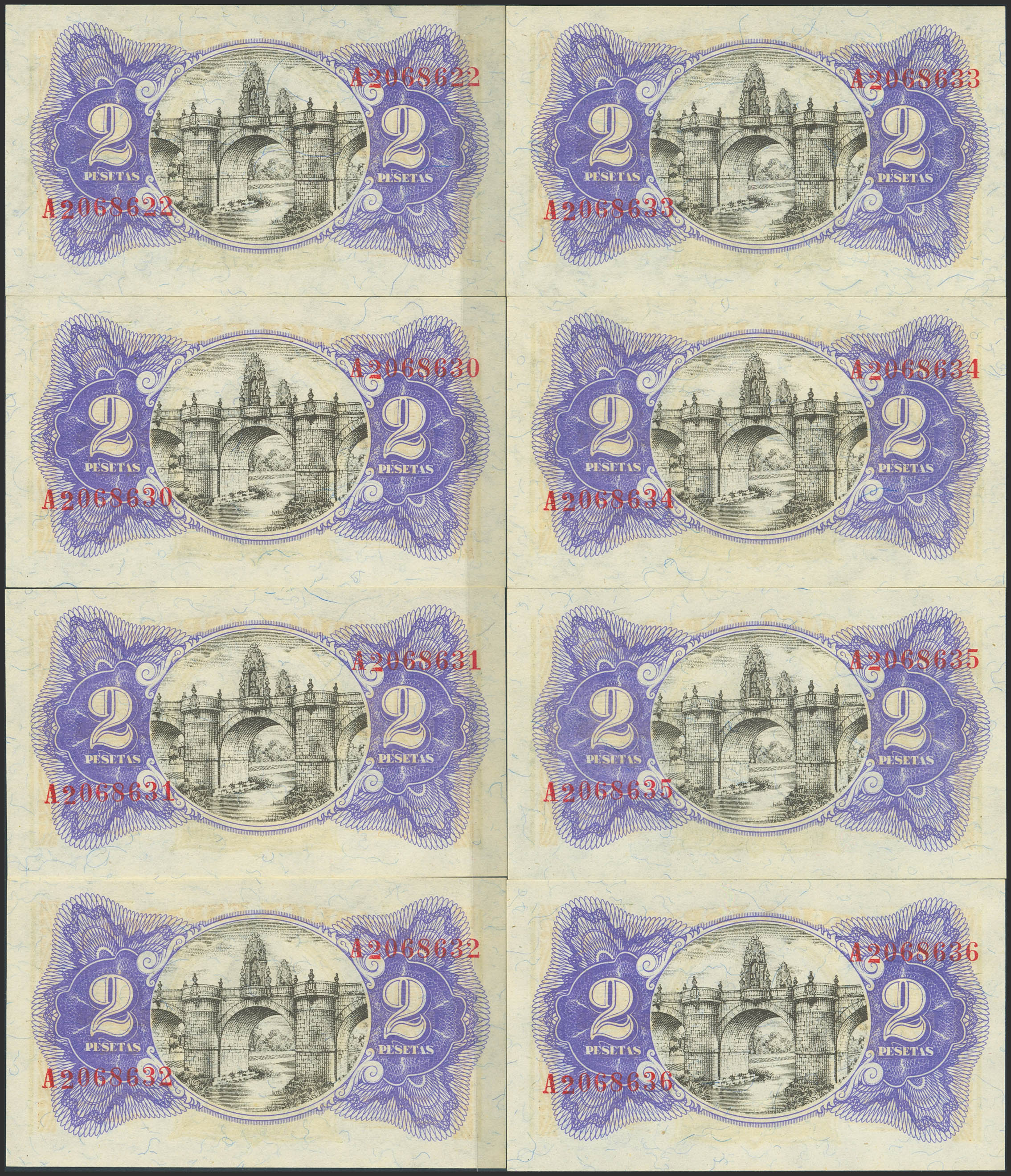 Conjunto de 8 billetes, 7 correlativos entre sí, del 2 Pesetas emitidos en 1937 con la serie A, (Edifil 2023: 393), conservando su apresto original. SC/SC-.